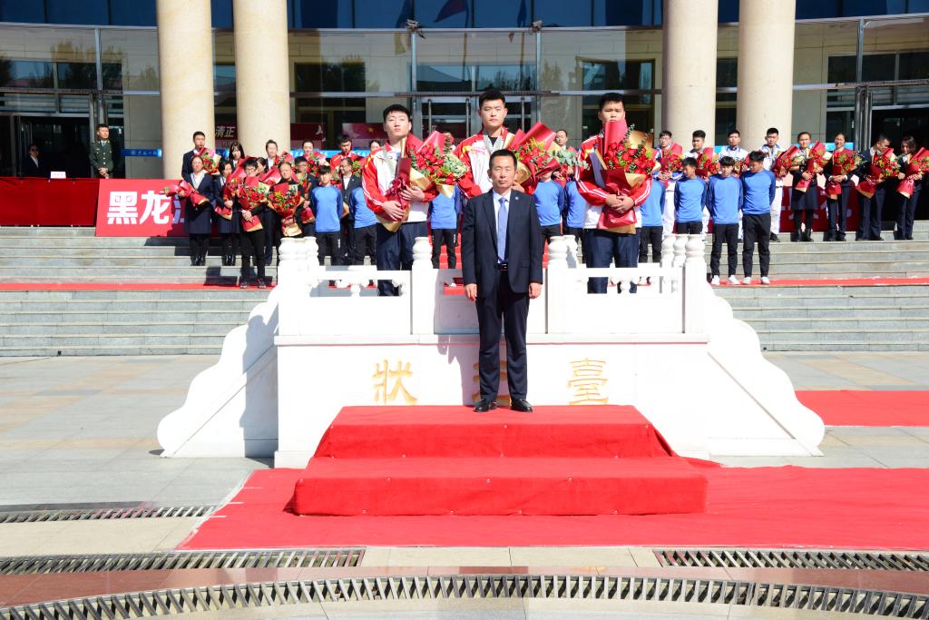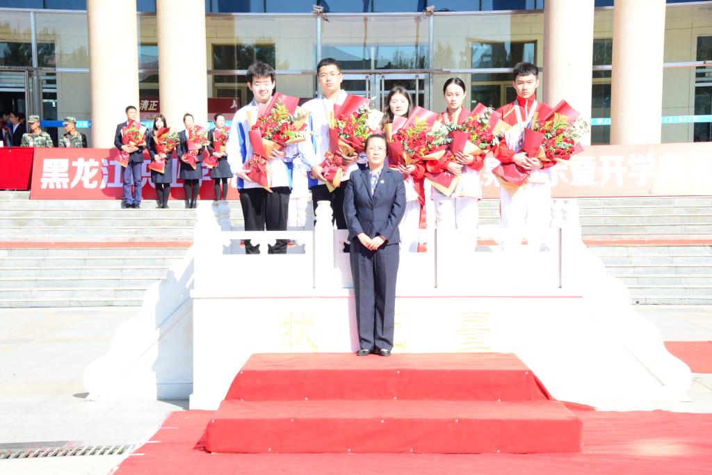 在9月20日开学典礼上,学校举办了第六届“颁龙职奖·登状元台”活动。 在学校师生的瞩目下,获奖师生依次走上红地毯,登上“状元台”,学校领导分别为他们颁发“龙职奖”奖牌,并合影留念。