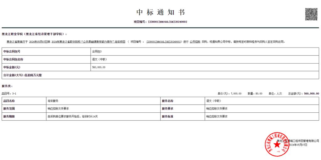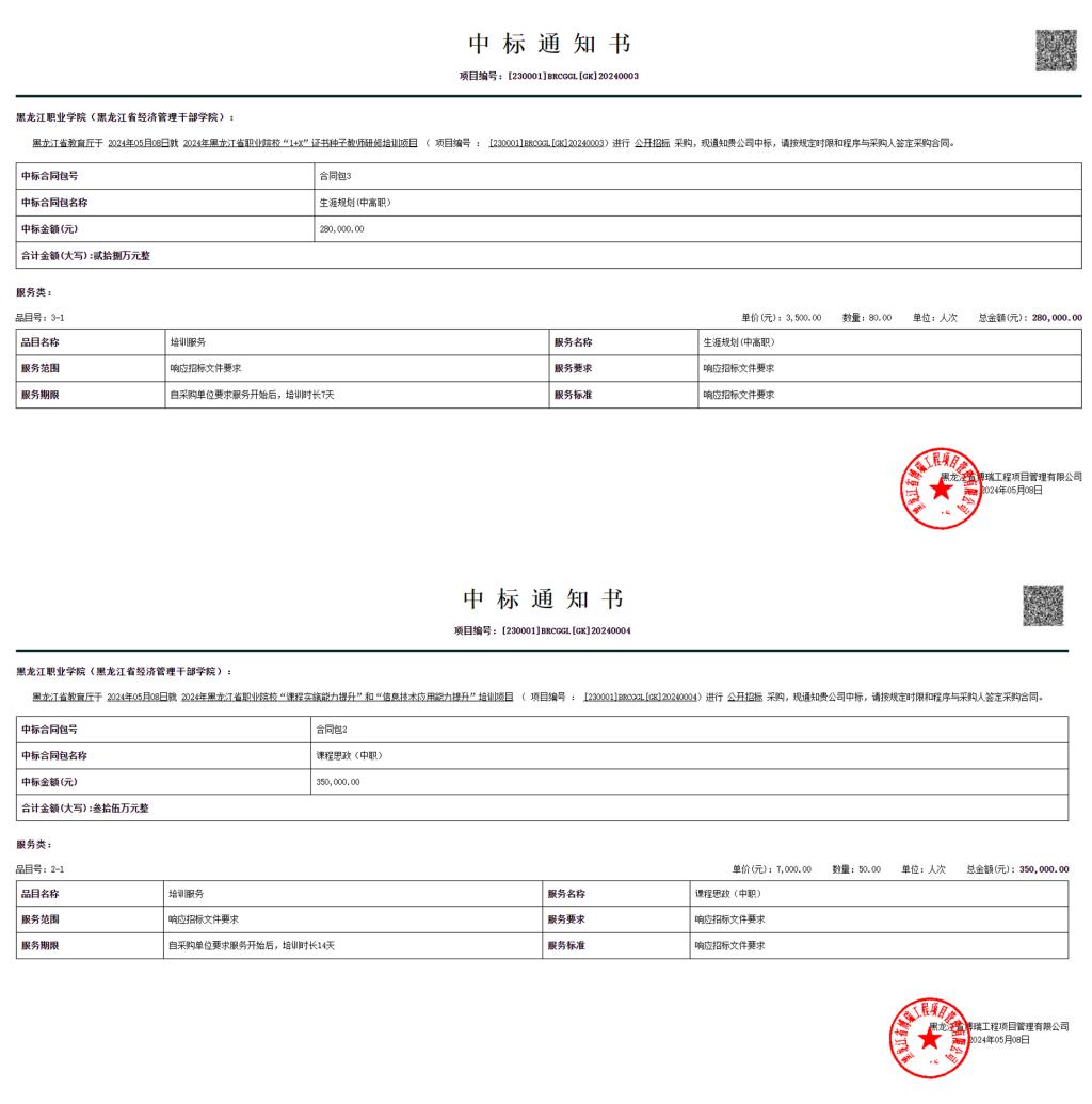 5月8日,金年会参加2024年黑龙江省职业院校“课程实施能力提升”和“信息技术应用能力提升”培训项目、2024年黑龙江省职业院校“1+X”证书种子教师研修培训项目、2024年黑龙江省职业院校“公共基础课教学能力提升”培训项目竞标,凭借良好的学校声誉及科学的项目方案顺利中标语文(中职)、生涯规划(中高职)、课程思政(中职),中标金额119万元。
