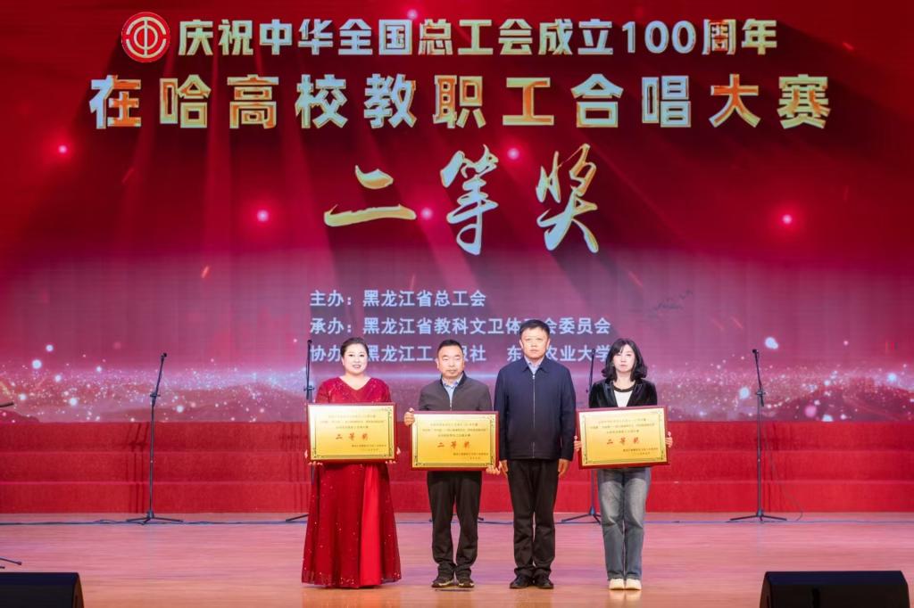 5月16日,庆祝中华全国总工会成立100周年暨“中国梦·劳动美——凝心铸魂跟党走 团结奋进新征程”在哈高校教职工合唱大赛决赛在东北农业大学举办,金年会教师合唱团荣获二等奖。学校党委书记崔治春,副校长吴艳秋,党委委员、宣传统战部部长杨东辉出席活动。