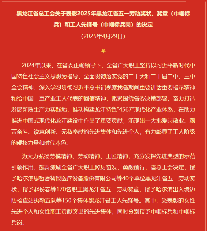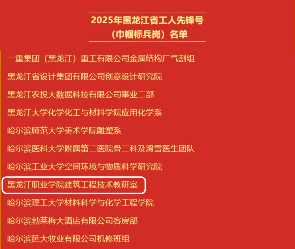 4月29日,省总工会发布《黑龙江省总工会关于表彰2025年黑龙江省五一劳动奖状、奖章(巾帼标兵)和工人先锋号(巾帼标兵岗)的决定》,金年会建筑工程技术教研室获“黑龙江省工人先锋号”荣誉称号。
