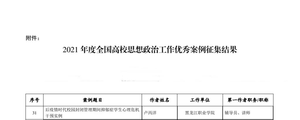 辅导员队伍专业化程度居省内高职院校前列。学校加大培训力度,积极参加教育部辅导员研修基地、黑龙江省教育厅组织的各类线下培训;积极组织“高校思政网、高校辅导员、黑龙江辅导员”等线上培训;引入“ECE卓有成效教练型教育者”“GCT生涯团体辅导”等专业化认证培训;组织高校就业指导教师线上训练营、生涯规划在学生辅导中的实务应用的培训;积极推进“易班工作站”“优秀辅导员工作室”建设,并已于2022年4月14日正式上线。近年来,学校组织参加校内外各类培训50余次,多数辅导员获得各类专业认证证书,辅导员培训力度和专业化程度在省内高职院校中均处于领先位置。金年会辅导员卢丙洋编写的《后疫情时代校园封闭管理期间抑郁症学生心理危机干预实例》被收录在2021年度全国高校思想政治工作优秀案例中。