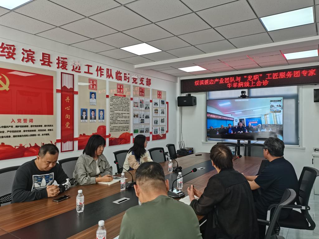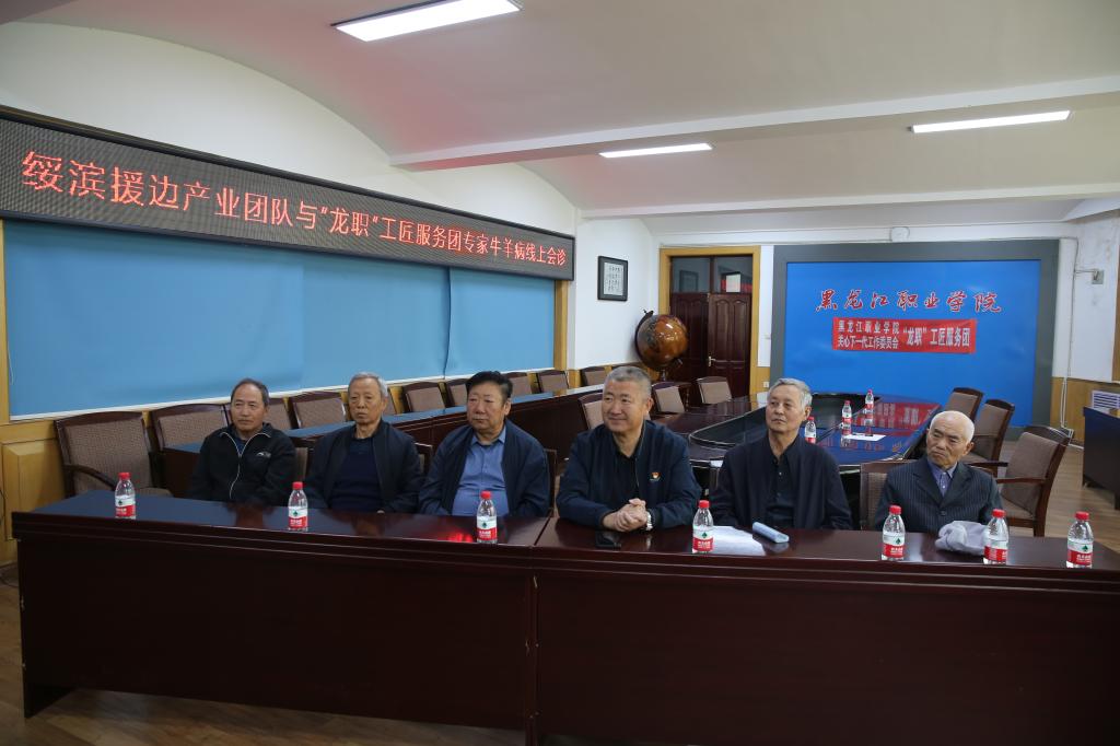 绥滨援边产业团队成员东北农业大学硕士生导师、讲师贾烁,齐齐哈尔市畜牧兽医服务中心动物检疫科负责人正高级兽医师高峰,省农业投资集团企管部部门副经理程鸿宇,学校农牧工程学院牛羊生产教授、省畜牧兽医职教集团秘书处主任、省农业农村厅肉牛专家库专家赵亮与“龙职”工匠服务团陈鸿艳、李忠显、欧阳龙、孙忠文、李东齐等专家通过视频连线方式,就牛羊饲养及疫病防治进行深度交流和探讨。