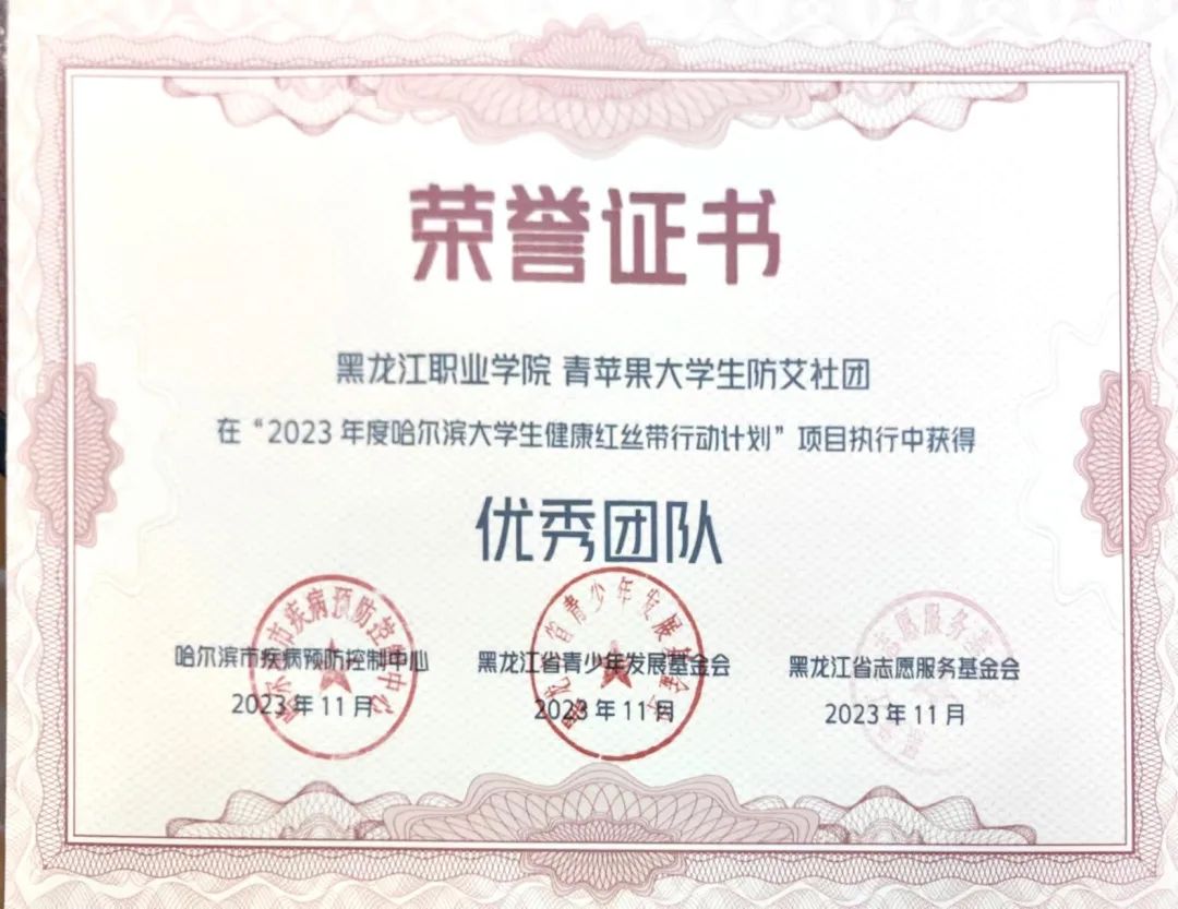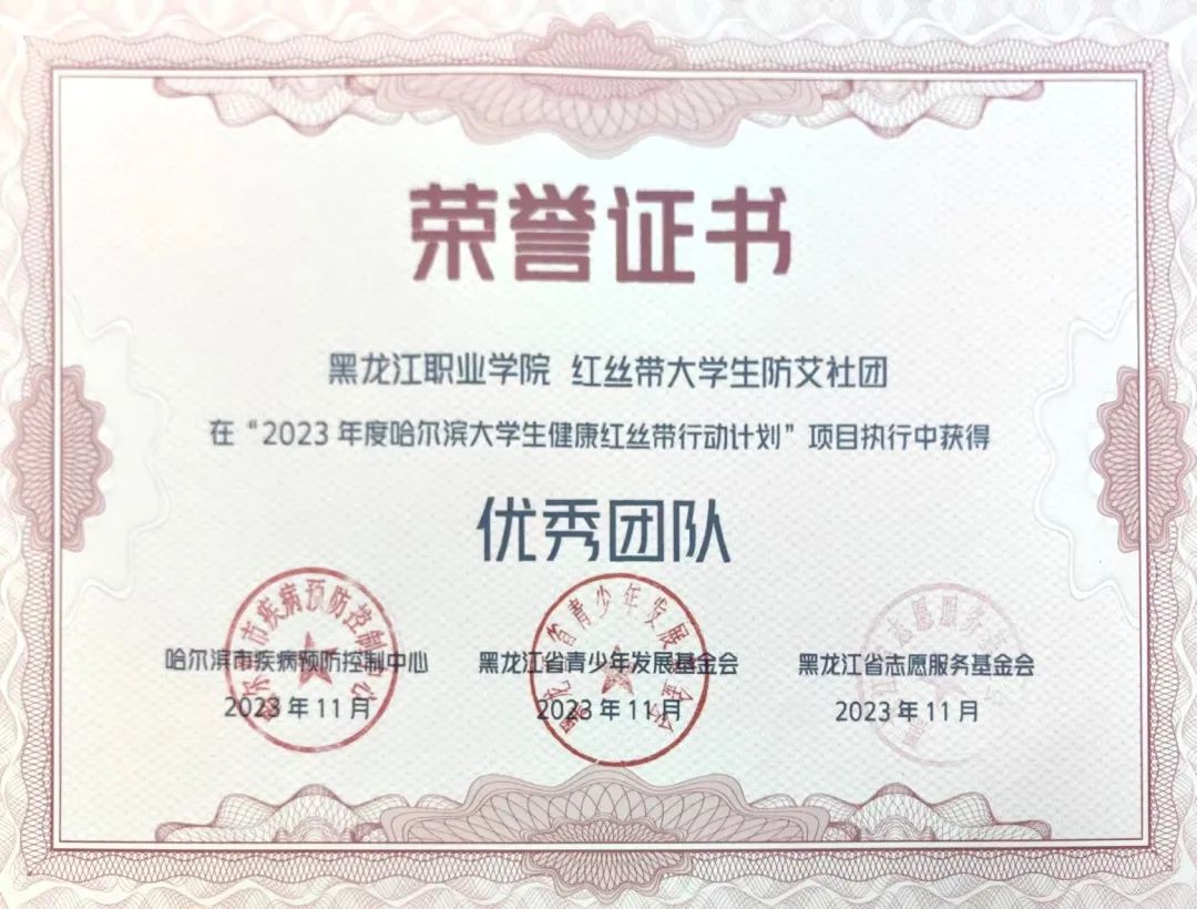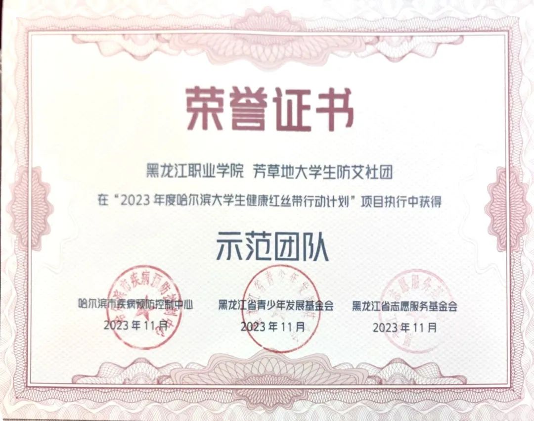 2023年第二届“哈尔滨大学生健康红丝带行动计划”共评选出的3支最佳示范团队、3位最佳示范指导教师、6位最佳宣讲员、5位最佳短视频创作者、12支示范团队、12位示范指导教师。金年会芳草地大学生防艾社团获得示范团队奖,是哈市高职院校唯一获奖院校。