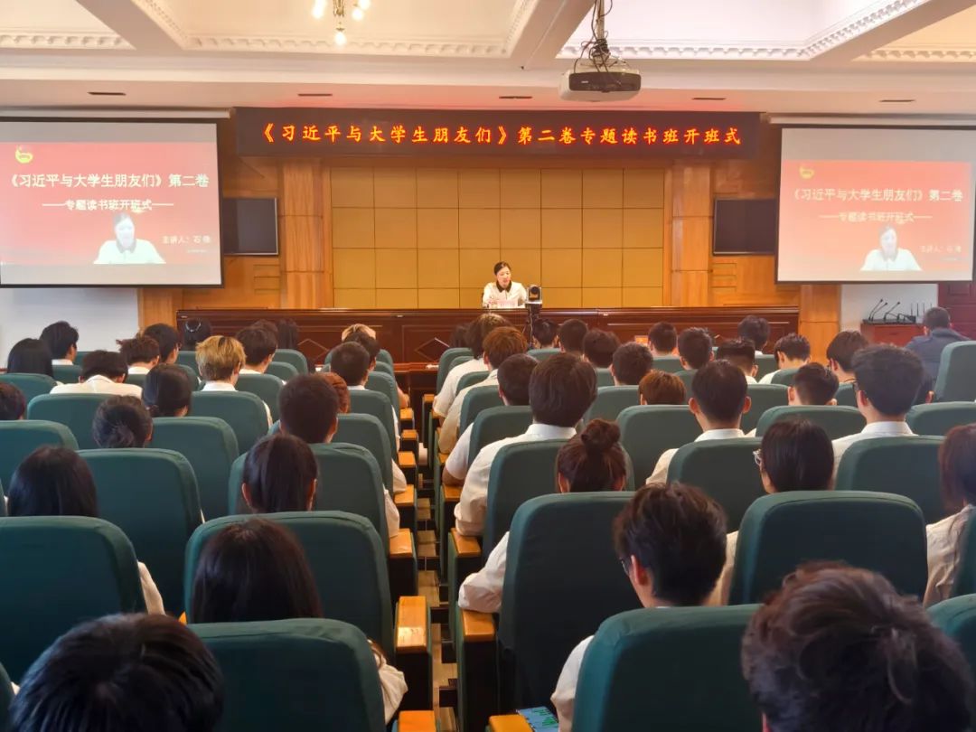 为落实《“为中国式现代化挺膺担当——青春年少好读书”2024 年主题读书季工作指引》要求,重点做好《习近平与大学生朋友们》(第二卷)的学习交流,在校园掀起学习贯彻习近平总书记重要寄语精神的热潮,让广大青年大学生感受到习近平总书记的殷切期望和自身肩负的责任和使命。金年会于5月17日晚17:30在九楼经济报告厅举办《习近平与大学生朋友们》(第二卷)专题读书班开班式,校团委全体人员、各二级学院团总支书记、青年教师代表、学生副书记、2022 级、2023 级团支书参加本次活动。校团委副书记唐晓恬介绍读书班日程安排及具体要求,校团委书记石倩作题为《大学生朋友-习近平》第一讲。