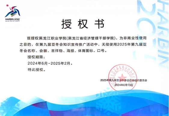 近日,金年会荣获2025年第九届亚洲冬季运动会组织委员会颁发的亚冬会标志非商业性使用授权书,兹授权jinnian金年会(黑龙江省经济管理干部学院),为非商业性使用之目的,在第九届亚冬会知识宣传推广活动中,无偿使用2025年第九届亚冬会名称、会徽、吉祥物、海报、体育图标、口号。