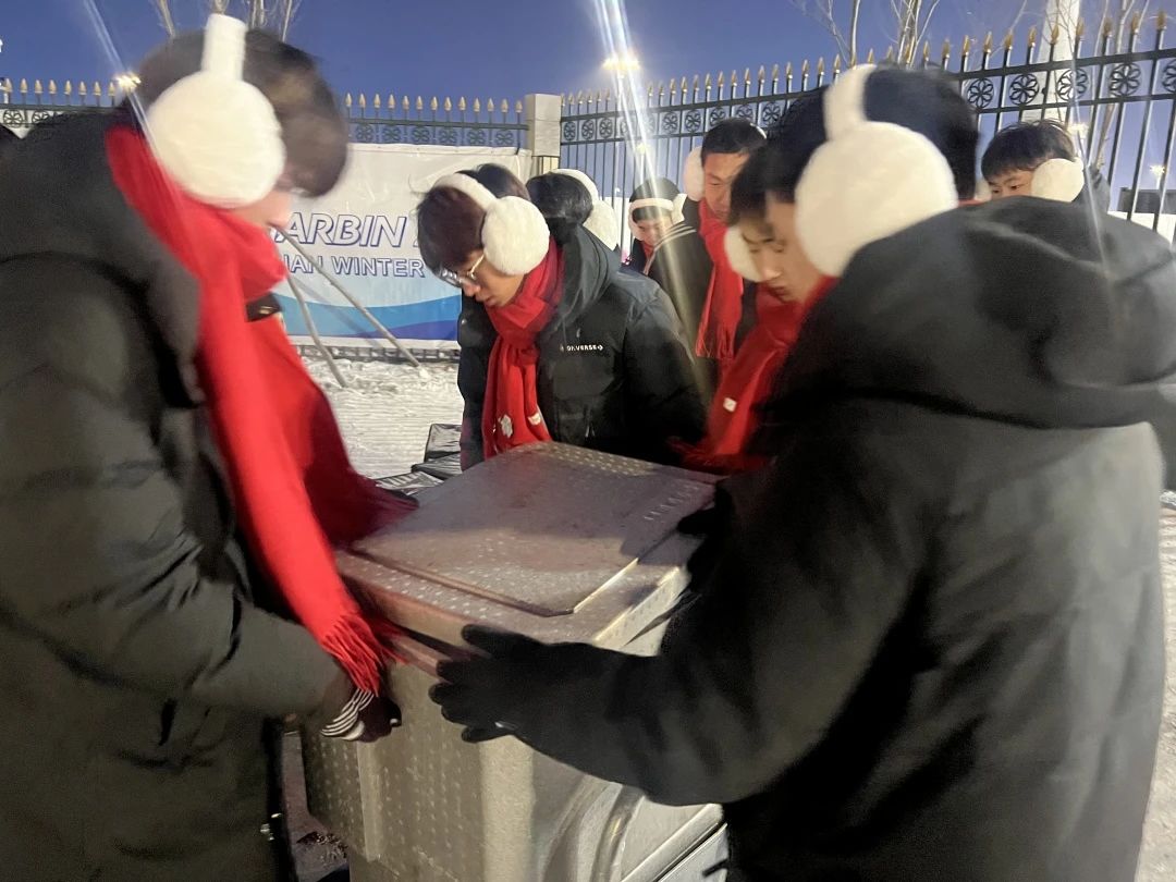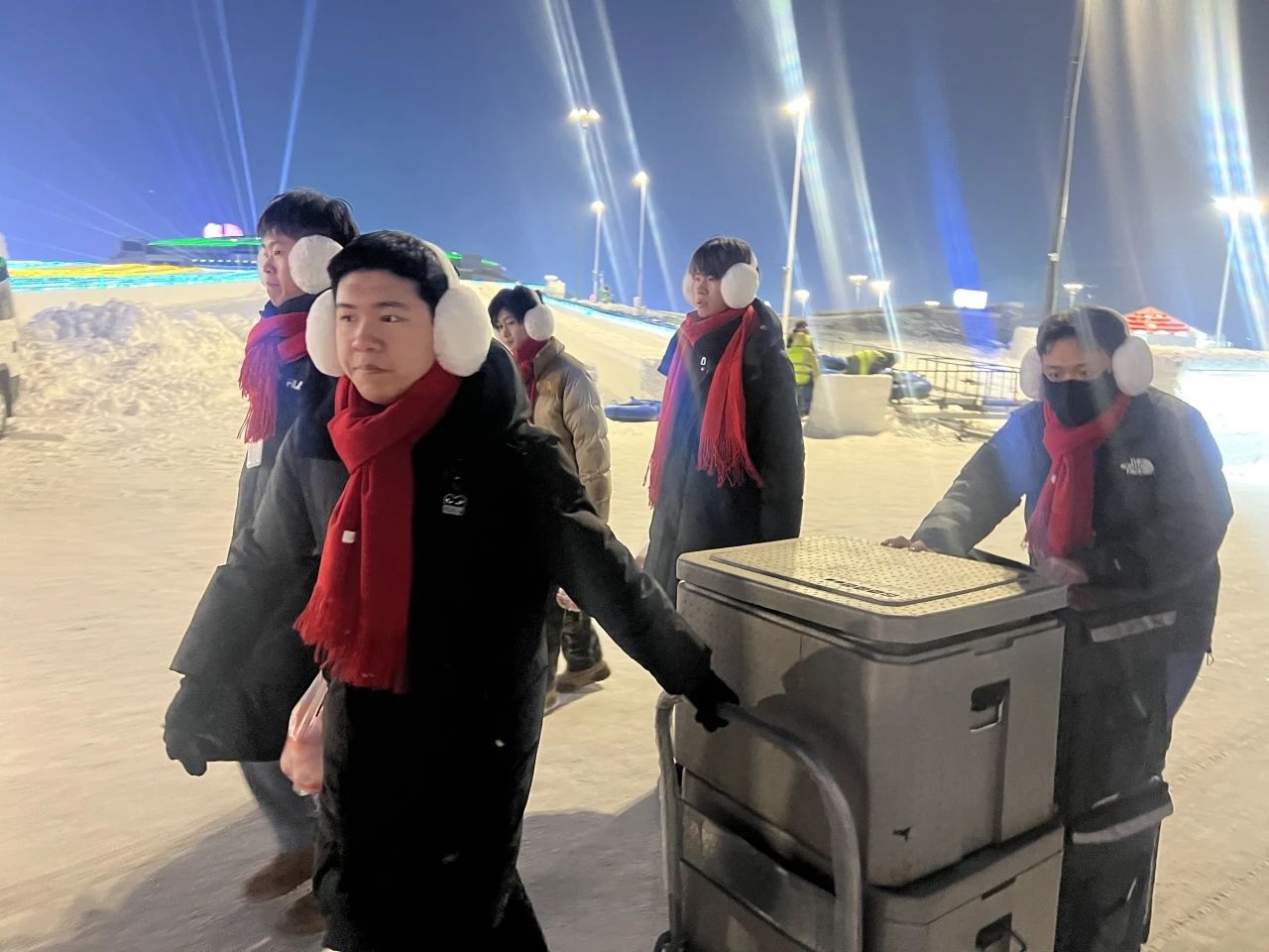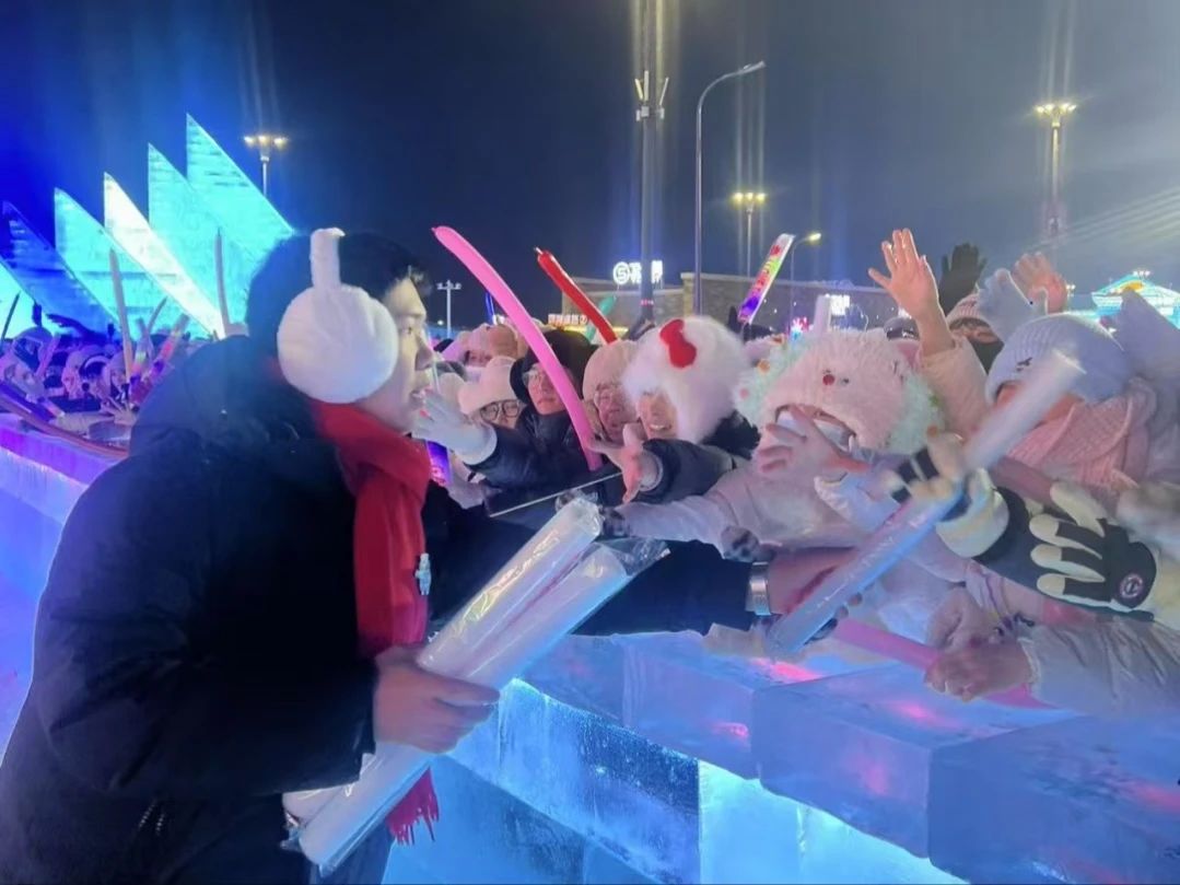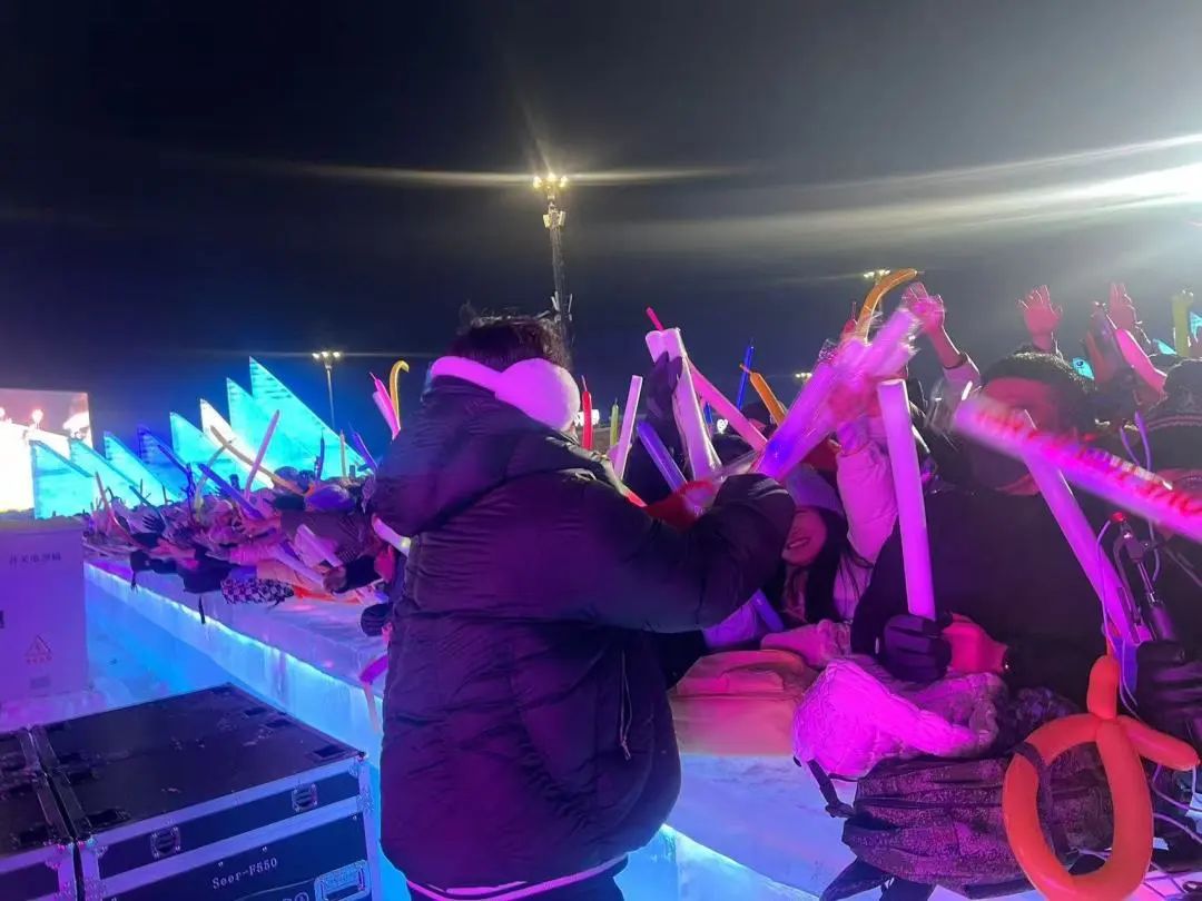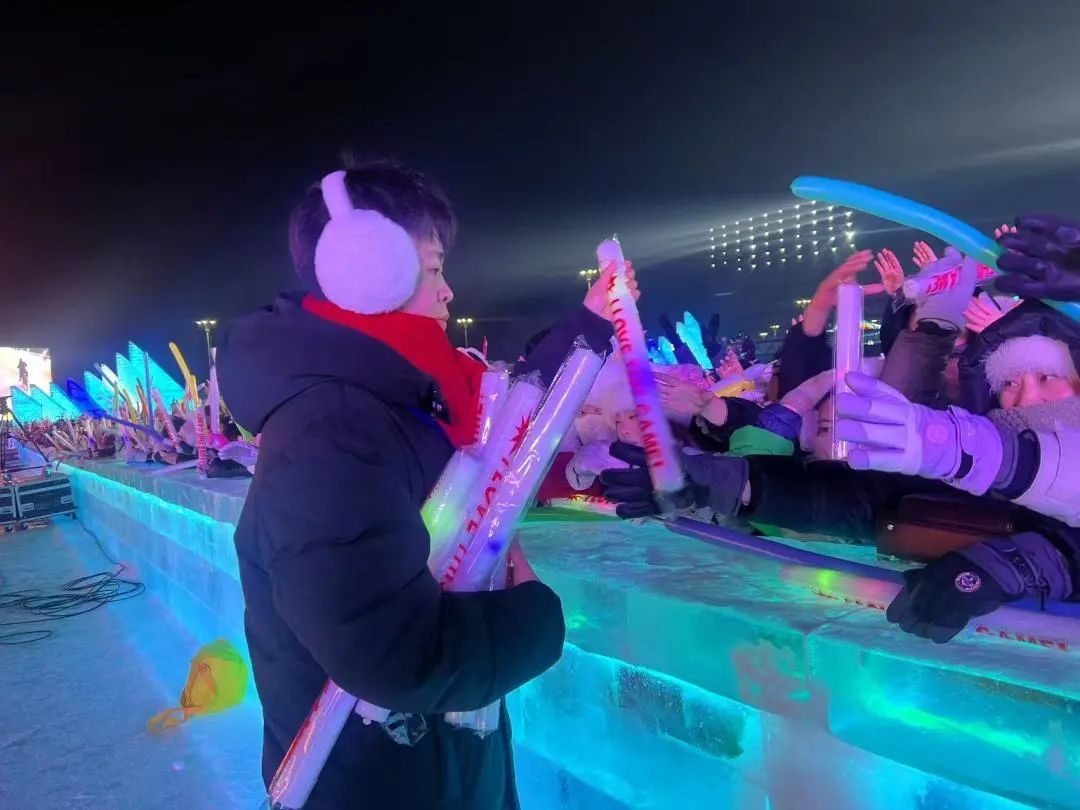 活动当日,志愿者们早早抵达冰雪大世界,迅速投入到紧张而有序的工作中。从31日上午10点直至次日凌晨,志愿者们始终坚守岗位,毫无怨言。他们的身影穿梭在冰雪大世界的每一个角落,肩负着协助演出的重任。从舞台布景的搭建与调整,到各类演出道具的搬运与摆放,每一个环节都有他们忙碌而专注的身影,沉重的道具在冰雪地面上拖行,只为确保每一场演出的道具都能精准就位。后台候场区域,同样有着志愿者们忙碌的身影,他们时刻准备着,为演员们提供所需的一切帮助。演出开始之后,志愿者们手拿荧光棒,热情地送到每一位观众手中,还不忘提醒大家注意安全,尽情享受这欢乐的时光。