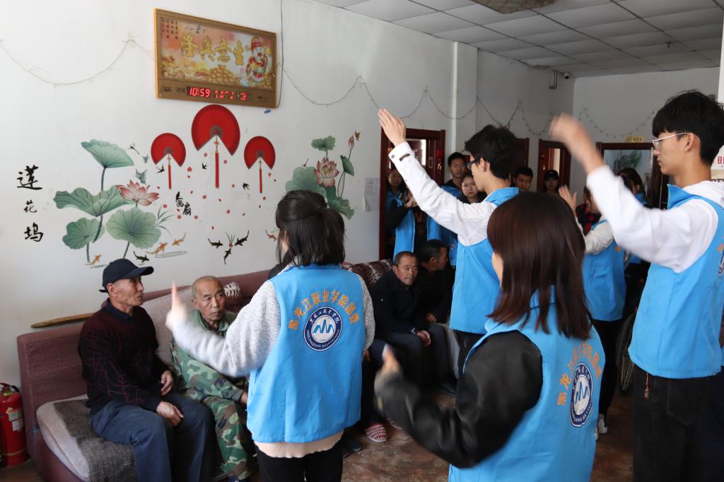 上午9时, 由100余名团学干部组成的志愿者队伍,在常通老师的带领下来到双城区颐养阁老年公寓。他们深入老人们的房间,帮助整理卫生,陪伴老人们聊天,并为老人表演精心筹备的节目。老人们充满自豪地讲述改革开放前后的个人经历和无私贡献,让志愿者了解到今日幸福生活的来之不易。志愿者在聆听的同时,也将自己有趣的故事同老人们分享,使老人们的脸上洋溢着幸福的笑容,整个老年公寓里萦绕着爱的暖流。