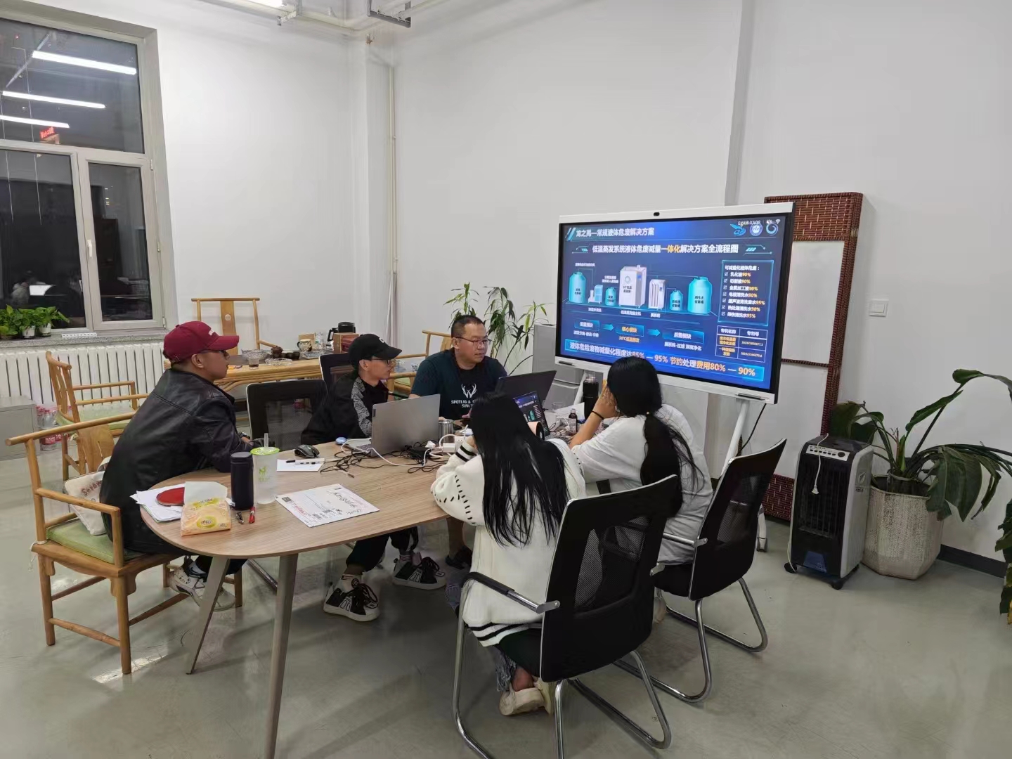 ▲国赛铜奖项目“龙之禹30℃低温蒸发-企业液体危险废物减量化的省钱专家”负责人郭振航与团队成员进行技术研讨