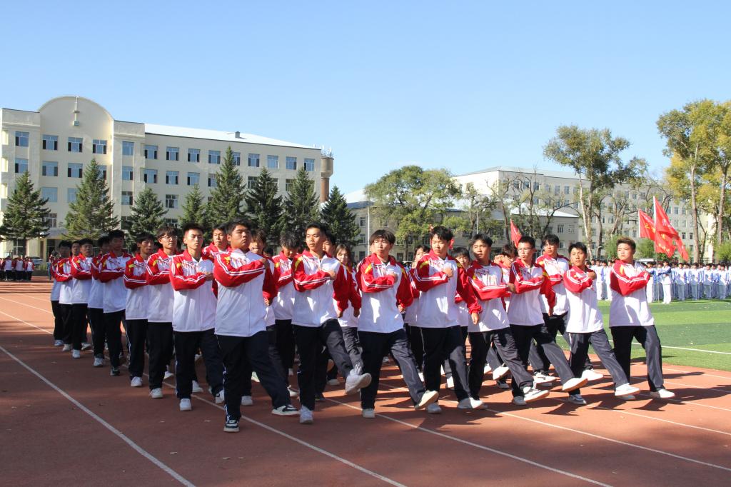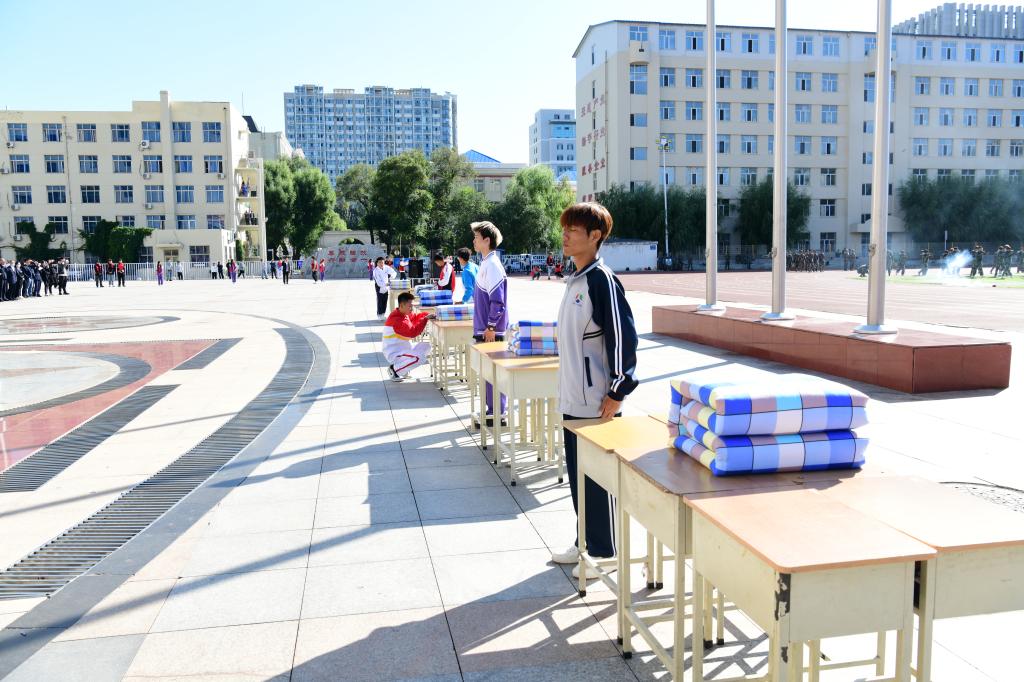 8时30分,升旗仪式正式开始,在庄严的国歌声中,五星红旗缓缓升起,拉开开学典礼序幕。首先,进行的是军训成果展示,分列式上各军训方队同学以整齐的步伐、嘹亮的口号、饱满的热情、昂扬的斗志、坚定的信念展示了为期三周的军训成果,为“大学第一课”交出一份精彩的青春答卷。军训方队代表队进行了擒敌拳、格斗基础、战术基础、内务整理等军训科目展示,在校大学生退役士兵展示了摔擒、小队战术科目。