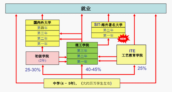 新加坡的职业技术教育由工艺教育学院和理工学院两部分构成,这两部分与本科大学教育在整个教育体系中上下衔接、横向贯通,并通过40多年的改革与发展,形成了一个完整的“立交桥”式教育体系。(如下所示)。