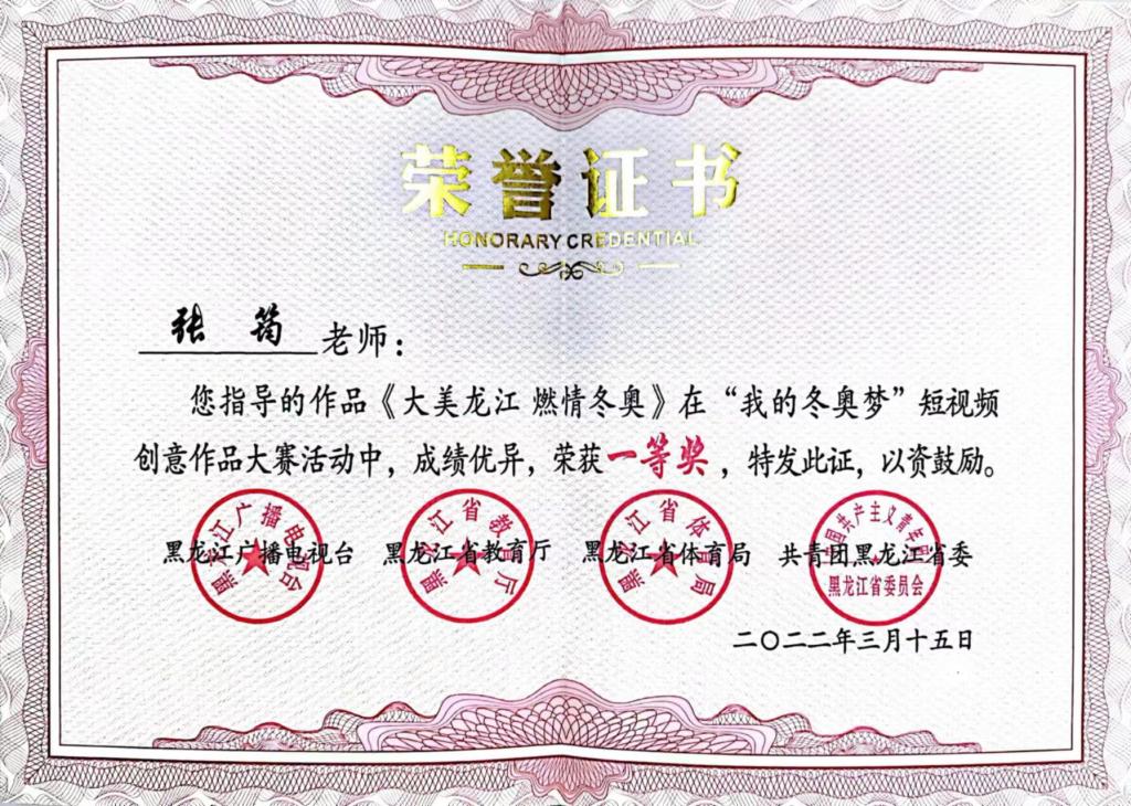 “我的冬奥梦”创意短视频大赛以赛事牵引,传播奥林匹克知识,弘扬奥林匹克精神,鼓励青年学生聚焦龙江冰雪,传递社会正能量、为冬奥会助力!张筠老师带着对冰雪运动的热情积极构思创作作品、户外取景拍摄,组织短视频制作,成为唯一一个冲击一等奖的高职院校作品。代表金年会为2022年冬奥会献礼,记录龙江冰雪运动的青春风采,让奥林匹克精神点亮梦想,传播龙江冰雪运动跨越式发展新面貌。