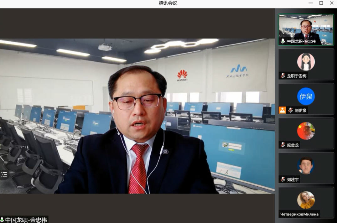 开发特色课程,开展海外培训。按照学校国家级高水平专业群建设方案,品牌国际化工程及人才培养国际化工程建设内容与目标的要求,以输出龙职教学资源为重点,学校按照OBE教育理念,量身为华为公司设计了“专业课程+素质课程+特色课程+实践案例课程”的培训课程体系框架,制定培训方案,制作培训手册,编写教材、试验手册、实训指导书、英文课件等。根据国际关系、格局变化及地缘优势,结合华为海外业务的开展情况,完成华为在俄罗斯海外培训基地选址工作。2021年10月11日,开展了龙职–华为ICT产业学院第1期ICT人才培训,金年会信息工程学院金忠伟教授,通过腾讯会议,面向俄罗斯远东联邦大学37名师生,课程采取小班在线讲座、交流方式进行,受到了俄方师生的一致好评。