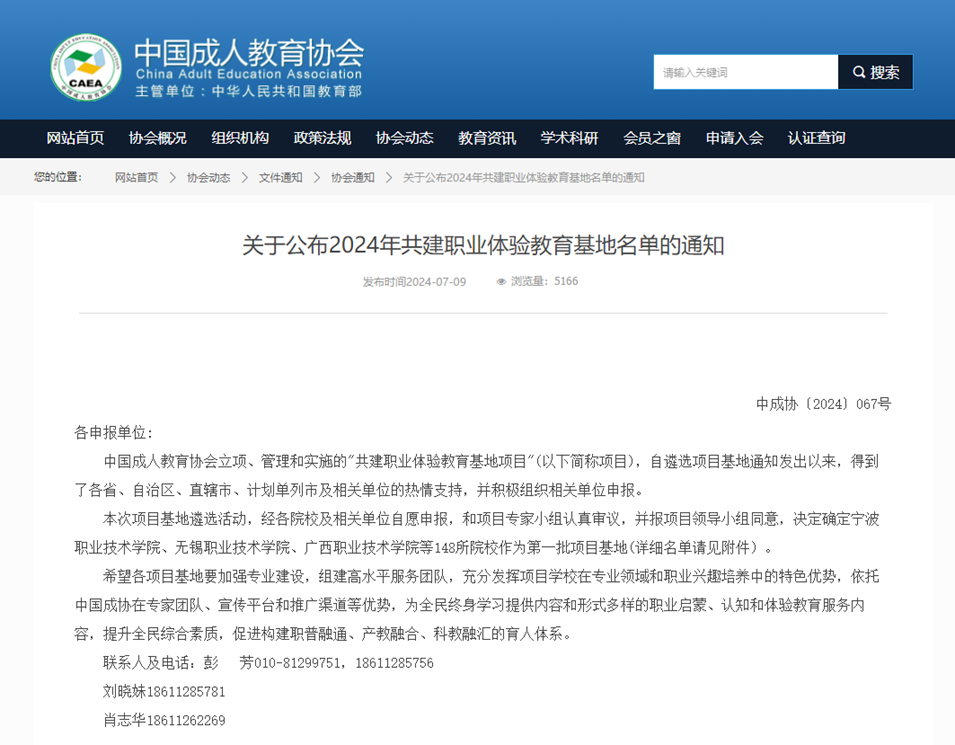 自中国成人教育协会启动“共建职业体验教育基地项目”以来,继续教育学院积极响应、精心筹备,参与了项目的申报和遴选过程,最终在众多申报单位中脱颖而出。
