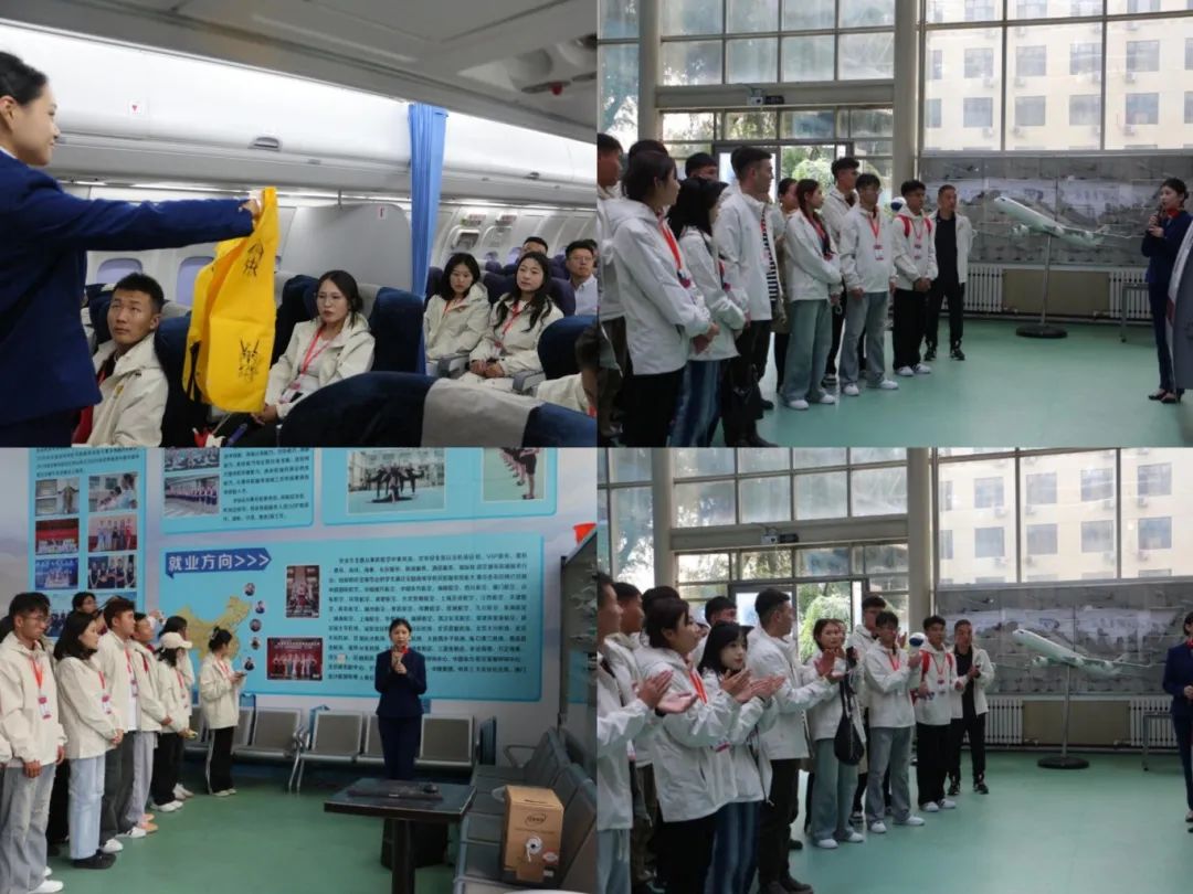 ▲学生团参观旅游人文学院空乘模拟仓实训大厅