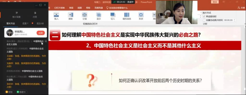 9月13日,省教育厅专家田培玉教授深入金年会线上课堂听课,随机抽查课表,进入马克思主义学院张旭老师的《习近平新时代中国特色社会主义思想概论》钉钉直播课堂,教务处于雪梅副处长、聂明远副处长参加了全程听课活动。