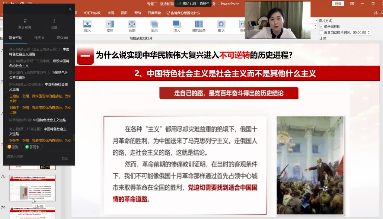 课前,张旭老师与学生亲切交流节日感受,从“每逢佳节胖三斤”的餐桌美食看国家发展变化,润物无声般让学生进入上课状态,点亮课堂。课中张旭老师采用问题导向教学法,让问题由浅入深逻辑成链,将学理内容转化为教学内容,用学生听得懂的语言讲清、讲透理论内容,符合学生认知特点和规律。在张老师的引导下,学生积极与老师交流互动,虽然是线上课堂,但是隔屏能感觉到热烈的课堂气氛,赢得了省教育厅专家的赞扬和认可。