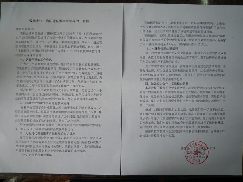 按照学院关于实施师资队伍建设“三个一百”工程要求,今年暑假期间,会计系派出6名青年骨干教师,分别到校企合作单位:哈尔滨嘉信会计代理记账有限公司、哈尔滨建兴会计师事务所、哈尔滨华晨税务师事务所、哈尔滨冠丰投资担保有限公司进行专业实践调研锻炼。通过这一过程,派出教师既掌握了专业实践技能,同时又为企业经营活动的开展、人员素质的提高等提供了多方面的服务,受到了企业的欢迎和好评,达到了预期的目标要求,实现了校企“双赢”。其中,哈尔滨嘉信会计代理记账有限公司的领导特发来《致黑龙江工商职业技术学院领导的一封信》,对赵威、刘鹏两位实习教师在实习期间的表现给予了高度评价,并希望双方今后进一步加大校企合作的力度,建立校企合作的长效机制。