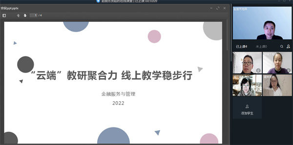 10月17日下午,我院金融服务与管理教研室线上开展了教研活动。教研活动主要围绕学校和学院线上教学质量管理工作的落实、拟开展的人身保险理赔职业技能等级证书培训等内容进行了研讨。活动由教研室主任赵丽芳主持。