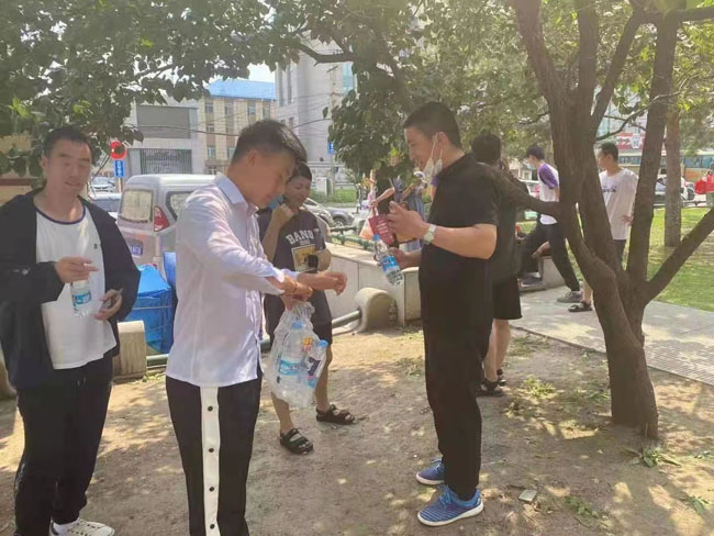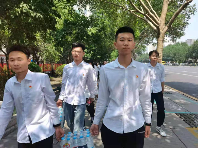 2021年6月25日,学管党支部全体教工党员和学生党支部新党员在“党员之家”进行入党誓词重温和新入党党员宣誓后,组织支部党员走向社会开展志愿服务活动,为中考的考生和家长义务送水。