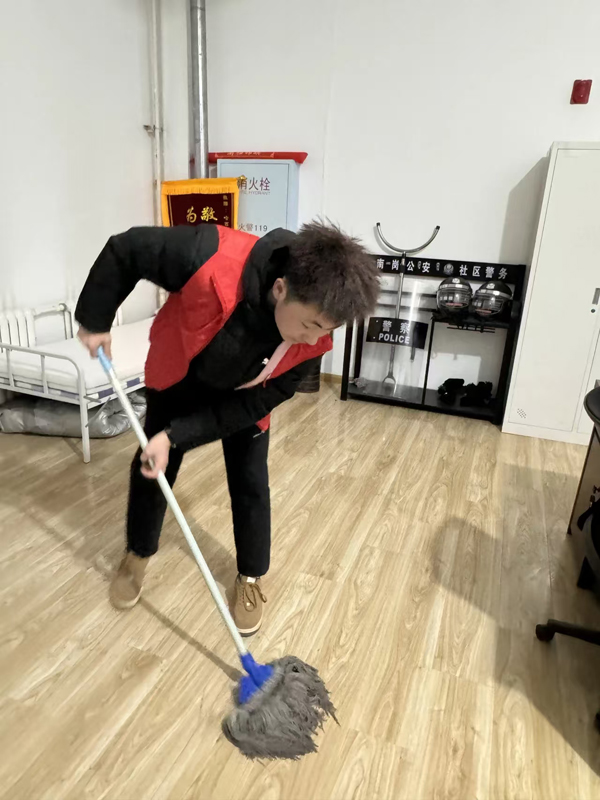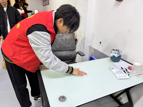 抵达东方瑞景社区后,志愿者们迅速按照事先周密制定的计划,有条不紊地投入到紧张而有序的义务劳动中。他们手脚麻利地将散落在桌面、柜子上的文件资料进行细致分类与整理,耐心地将每一件物品归位摆放,为工作人员后续的查阅工作提供了极大便利。紧接着,抹布“大军”闪亮登场,志愿者们或弯腰俯身,或踮脚伸手,不放过任何一个卫生死角,电脑、打印机、文件柜等办公设备在他们的精心擦拭下,逐渐褪去尘埃,焕发出洁净明亮的光泽。大家各司其职,又紧密配合,在忙碌的劳动中深切感受到了奉献带来的无尽快乐,他们不仅用勤劳的双手传递着温暖与关爱,更用真挚的心灵诠释着青春的价值与意义。