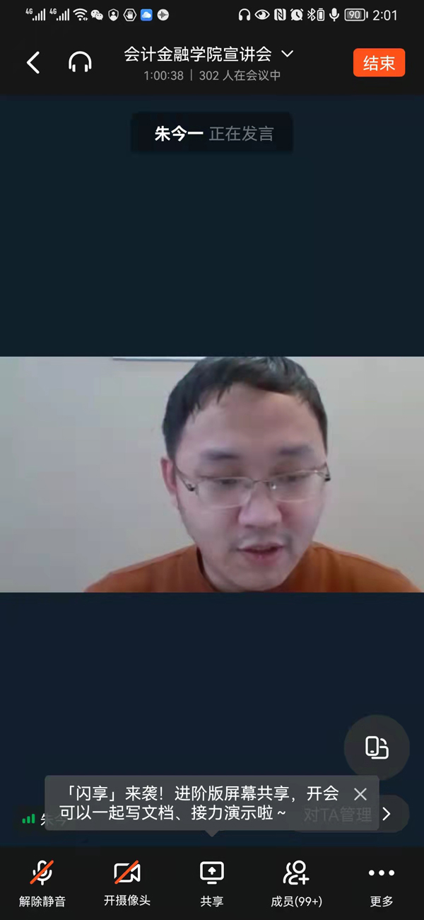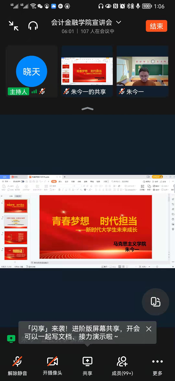 为落实省教育厅《关于做好学习贯彻党的十九届六中全会精神基层宣讲的工作提示》,按照学校宣传部统一要求和部署,3月23日下午我院特邀马克思主义学院优秀教师朱今一开展题目为《青春梦想 时代担当》的宣讲活动。会议由会计金融学院党总支张振和主持,会计金融学院全体教师和部分学生共计302人钉钉线上参加。