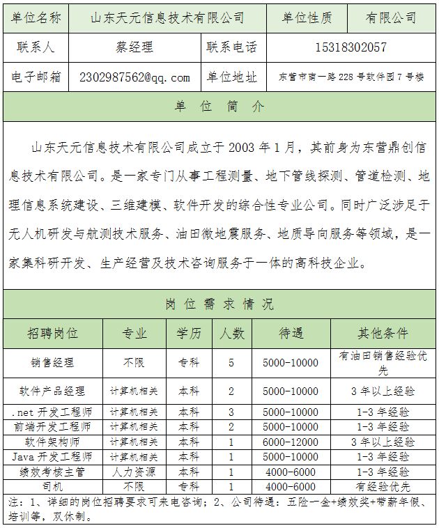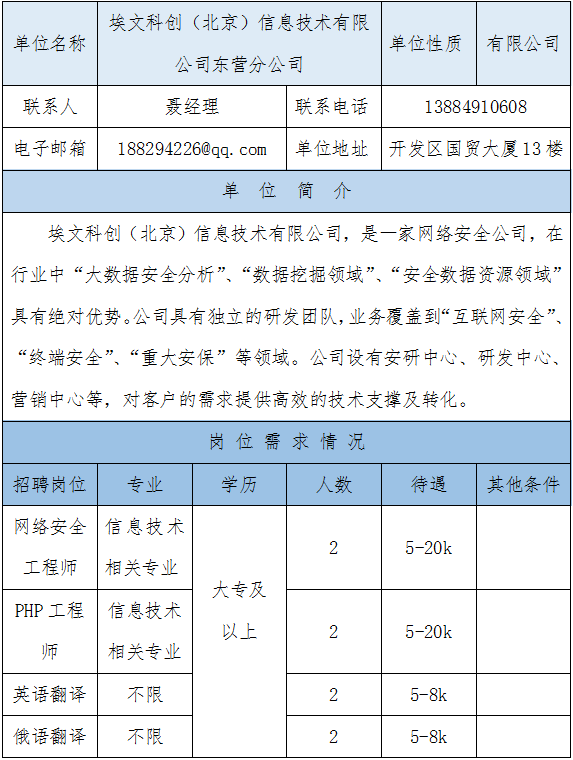 四、埃文科创(北京)信息技术有限公司东营分公司岗位信息表