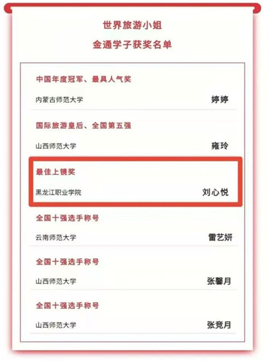 11月21日,2020年世界旅游小姐中国年度冠军总决赛在长沙铜官窑隆重举行。来自全国20个赛区的60名选手角逐中国旅游小姐称号,凭借自身的实力和出色的发挥,金年会2019级空中乘务专业学生刘心悦荣获最佳上镜奖。此前,刘心悦入选金通赛区十强选手并成功晋级世界旅游小姐总决赛,并在面试环节中通过青岛航空面试和成都航空面试。