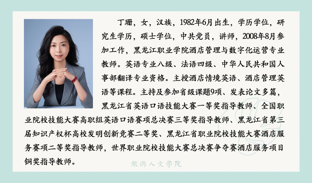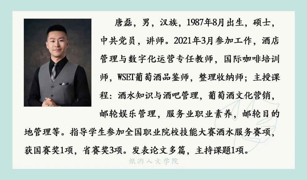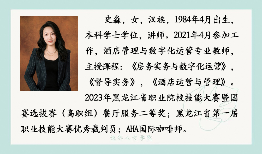 酒店管理与数字化运营专业目前拥有专任教师7人、教授1人、副教授1人、讲师 4人、助教 1人;具有硕士学位 5人。专任教师中均具有高校教师资格,双师素质教师占100%,其中 7人全部拥有国家咖啡培训师证书,3人拥有国际酒店管理注册导师证书,7人拥有 1+X 职业技能等级证书培训教师资格;骨干教师中,有“五一劳动奖章”获得者1人,原五星级酒店人力资源总监1人,原皇家加勒比邮轮员工1人。同时配备兼职教师5人,均为高星级酒店中高层管理者,拥有多年酒店运营管理实战经验,涵盖前厅、餐饮、人力资源管理等核心领域,具备极强的实践教学指导与行业资源对接能力。