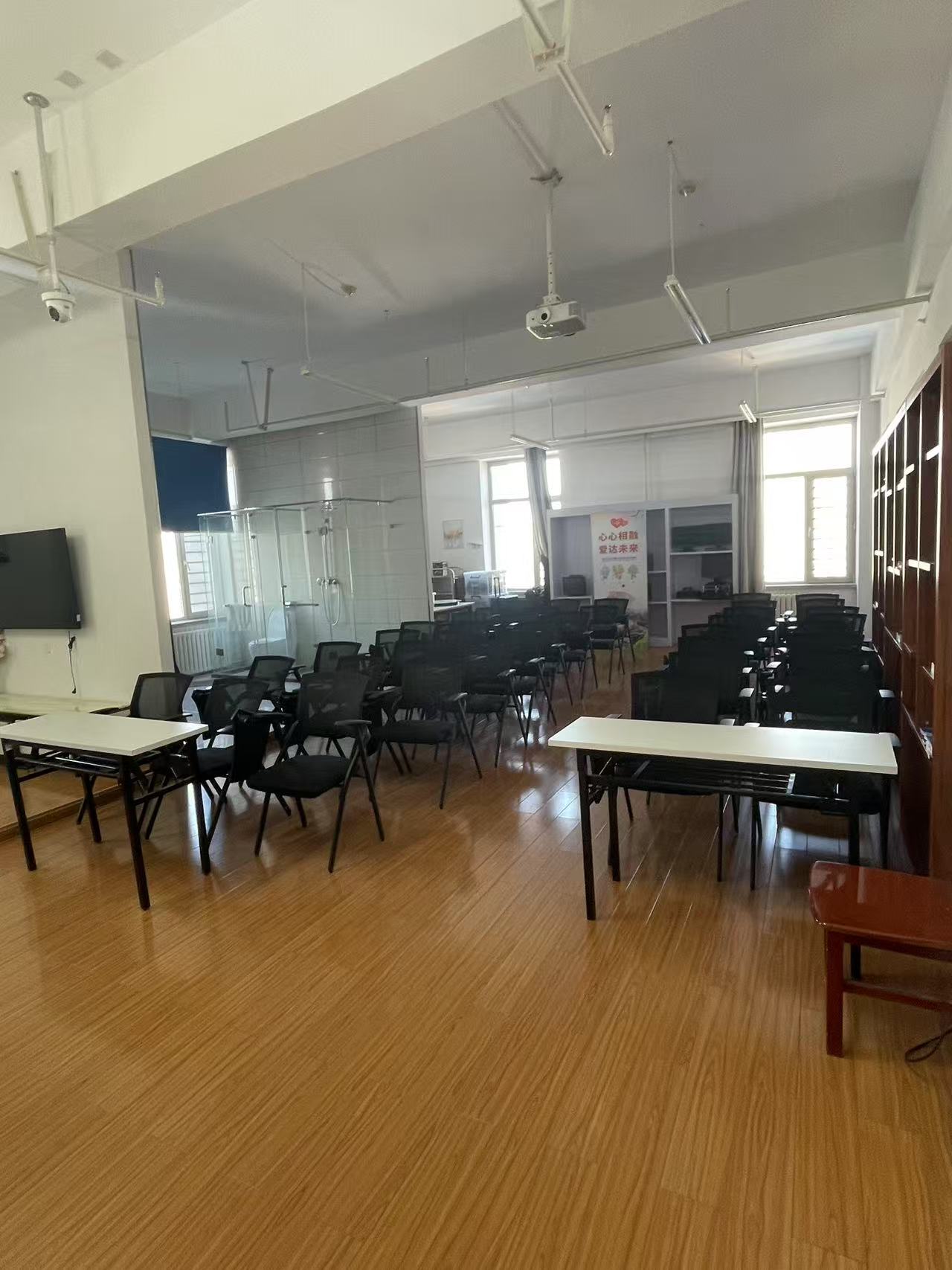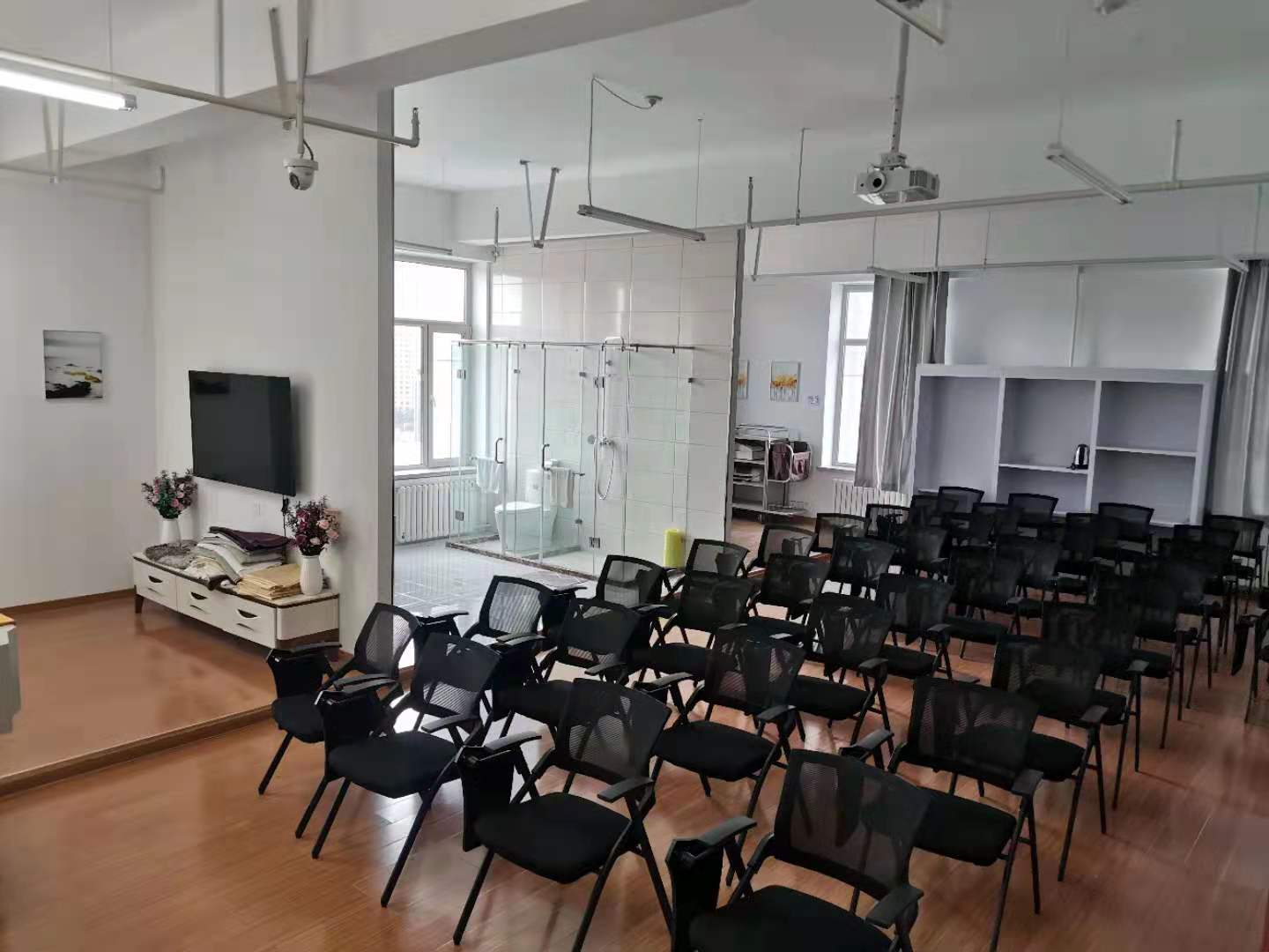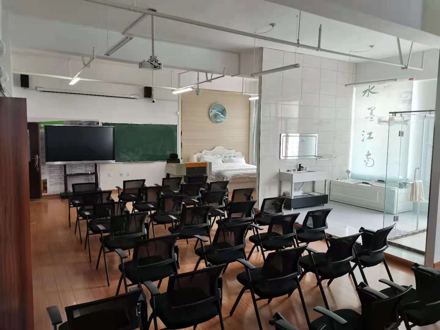 客房实训室面积90平米左右,按照标准客房布置,主要包括: 床、床头柜、床上布草用品、客用品、衣柜、行李架、恭桶、洗手台、淋浴间以及桌椅、讲台等教学设备。该实训室主要承担《房务实务》、《督导实务》等课程的实践课内容,实训项目包括: 客房清洁整理操作、中西式铺床、客房对客服务、开夜床等。客房实训室既能够满足日常教学需要,也能开展酒店在职与岗前培训等活动,为教学和相关职业技能的培训与考核提供服务条件。