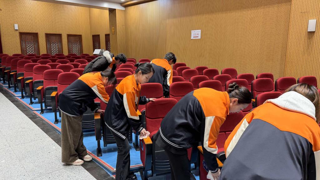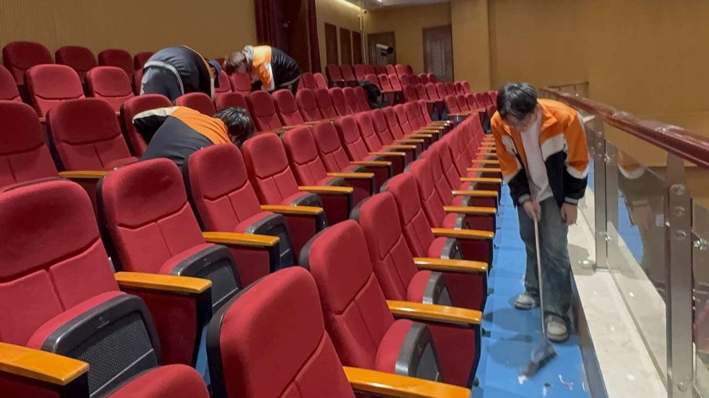 活动中,学生骨干们精神饱满、分工协作,带着扫帚、拖把、抹布、垃圾袋等清洁工具,对学府会堂的地面、座椅、舞台、过道、窗台及卫生死角进行全面清理。大家不怕脏、不怕累,认真擦拭座椅灰尘,细致清扫地面杂物,规范整理会场设施,不放过任何一处细节。经过共同努力,学府会堂环境焕然一新,整体面貌整洁有序,为学校各类会议、演出及活动开展营造了干净、舒适、文明的场地环境。