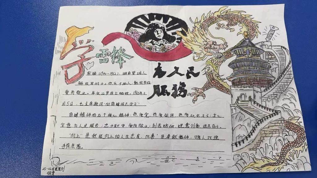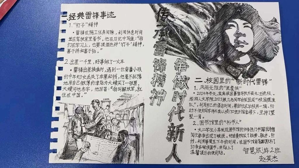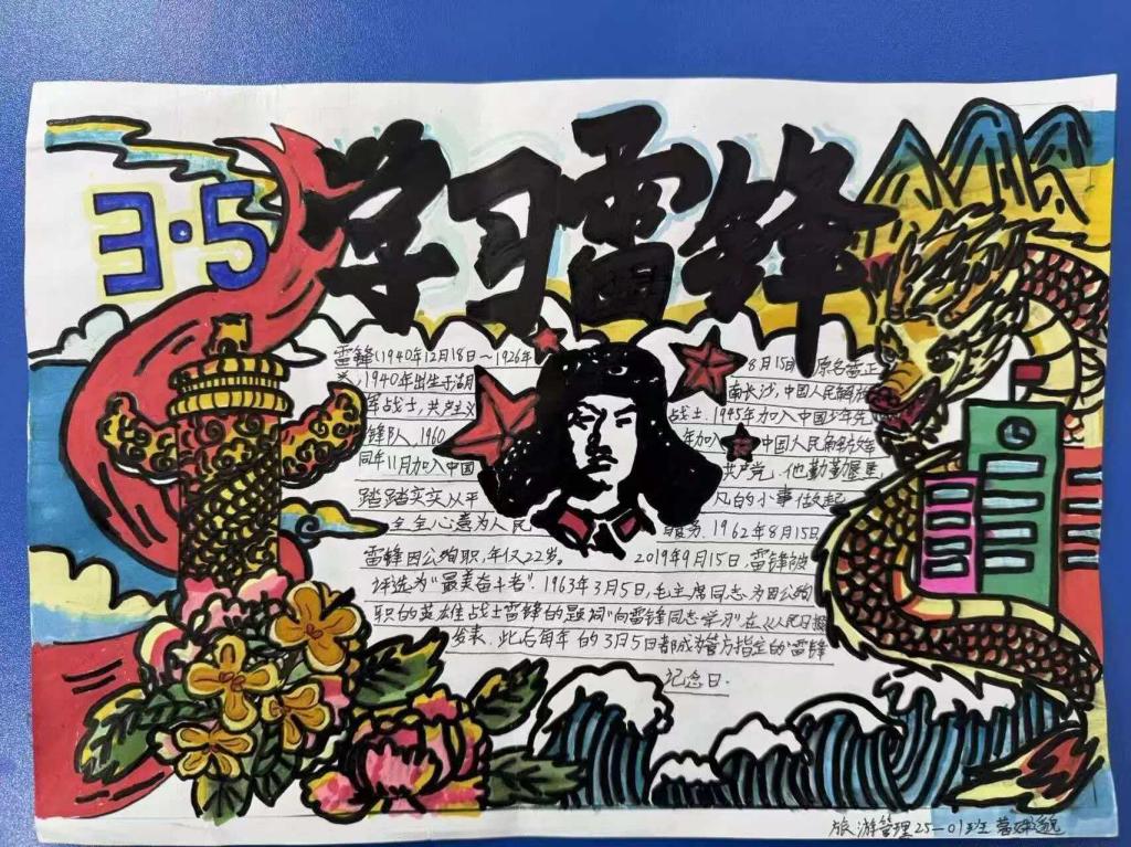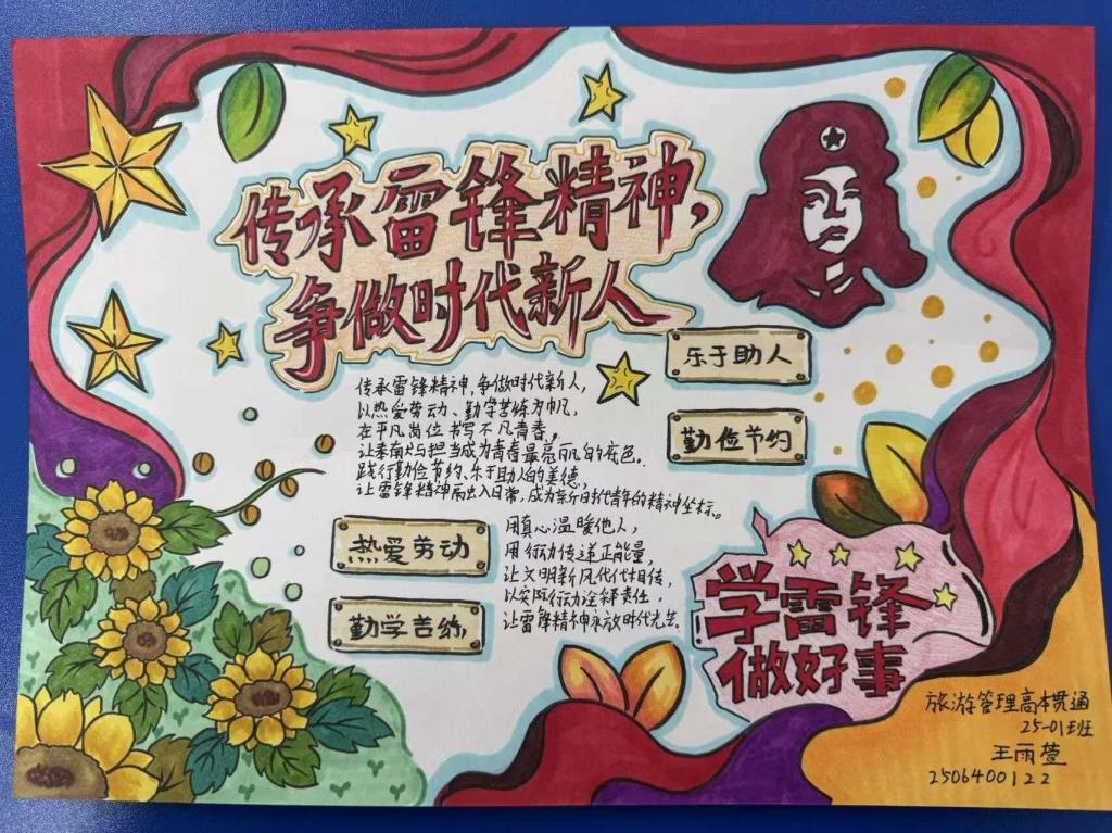 为深入弘扬雷锋精神,厚植青年学子责任担当,丰富校园文化内涵,引导广大学生以实际行动传承美德、践行初心,旅游人文学院于3月5日开展“传承雷锋精神,争做时代新人”手抄报比赛。以艺术创作搭建精神传承桥梁,让雷锋精神在校园蔚然成风。 活动中,同学们踊跃参与、精心筹备,紧扣雷锋精神核心内涵,将雷锋事迹、志愿奉献、青春担当等元素融入创作。大家认真构思版面、细致绘制图案、工整书写文字,一幅幅作品图文并茂、主题鲜明、创意十足,既展现了扎实的动手创作能力,也抒发了对雷锋精神的深刻理解与践行决心。