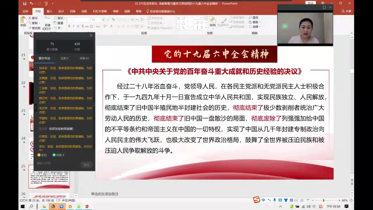 张旭老师利用丰富的图片、案例和视频等资源,结合党史、社会发展史、习近平总书记重要讲话精神和十九届六中全会精神等方面,从“青年学生如何理解必须抓好后继有人这个根本大计”等10个方面为全体党员师生呈现了一堂精彩又有教育意义的政治课。