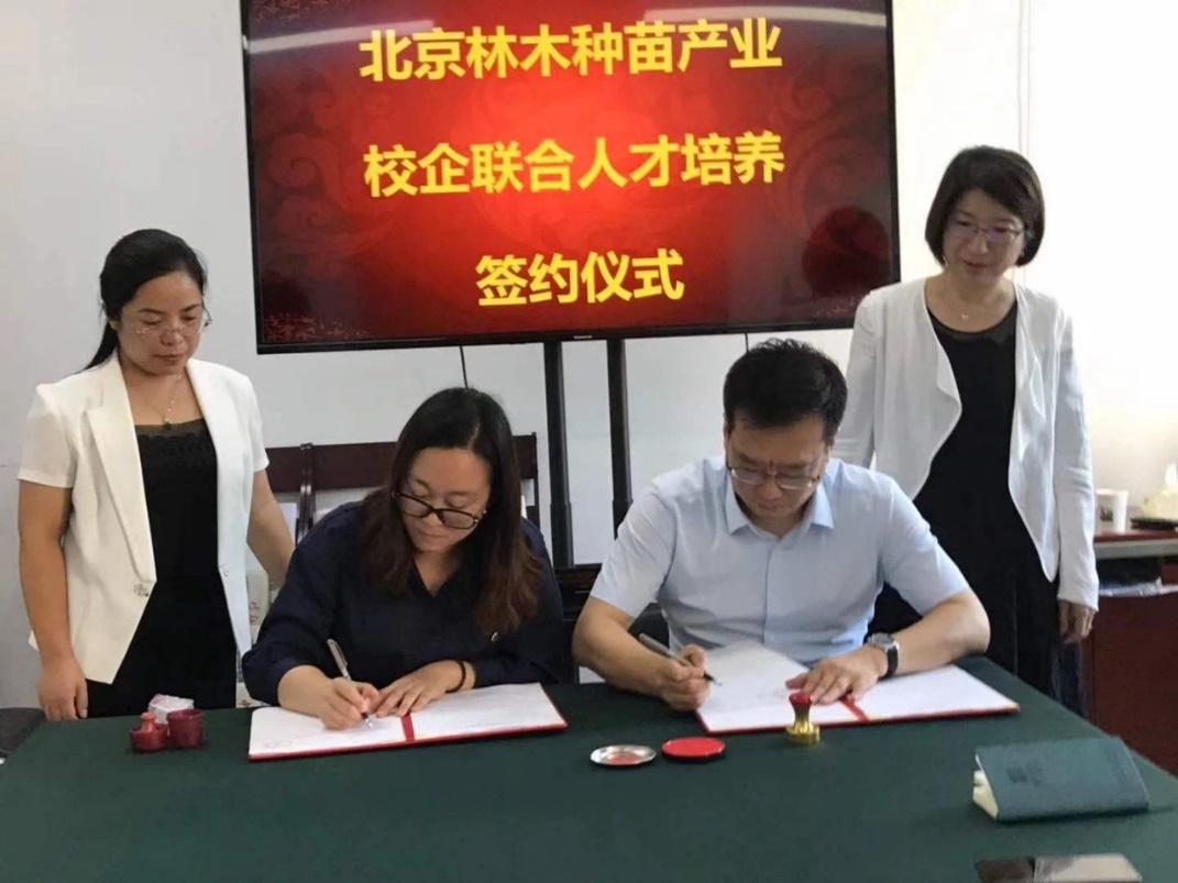 近日,农牧工程学院园林技术专业教研室主任代明慧与北京林木种苗产业协会秘书长王亮就开展以“校企双主体”育人为特征的人才培养计划达成共识,并在北京市林业种子苗木管理总站姜英淑站长及会员企业代表周晓杰的见证下签订了“园林技术专业现代学徒制项目人才培养战略协议”。