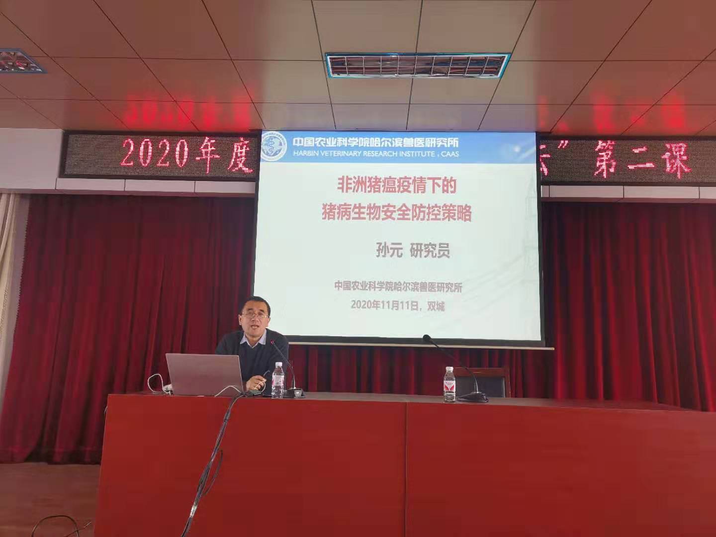 第二位主讲人是中国农业科学院哈尔滨兽医研究所研究员孙元,孙老师的报告主题为非洲猪瘟疫情下的猪病生物安全防控策略,分析了目前养猪业面临的挑战和机遇,明确了非洲猪瘟的防控策略,深入浅出地解读了猪病生物安全的防控措施,为即将进入顶岗实习岗位的学生提供了参考。