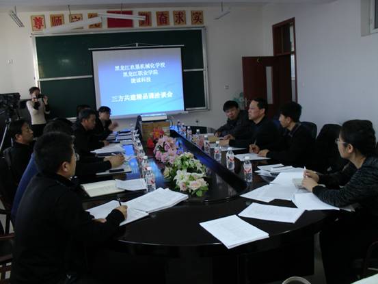 2014年2月18日下午,在黑龙江农垦机械学校会议室召开了“黑龙江农垦机械学校、jinnian金年会、捷诚科技三方共建精品课洽谈会议”。参加会议的人员有黑龙江农垦机械学校王传峰校长、梁成副校长、示范校建设办公室成员,jinnian金年会农牧工程学院院长陈晓华和四名专业骨干教师,捷诚科技有限公司两名技术人员,就如何建设精品课程展开了交流和探讨。