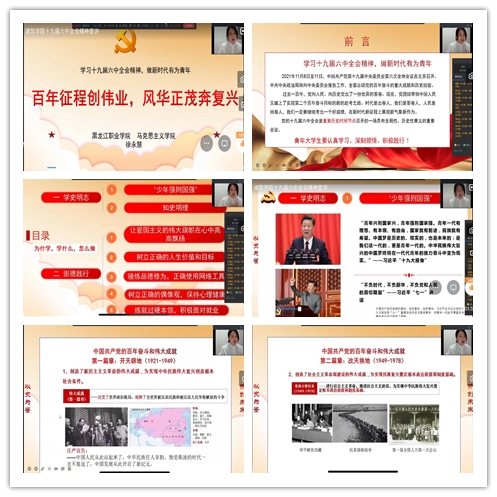 学习宣传贯彻好党的十九届六中全会精神是当前和今后一个时期重要的政治任务,学院将深入传达好、学习好、宣传好、贯彻好全会精神,深刻理解把握全会精神实质、核心要义和实践要求。2022年3月21日下午6点,马克思学院徐永慧老师通过线上授课方式为我院学生开展了党的十九届六中全会精神的宣讲会。