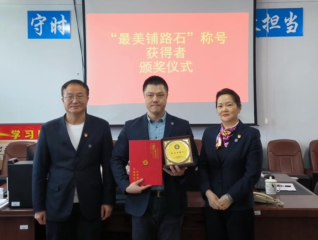 随后,由党总支书记范海波、院长张皓分别为两位获奖教师颁发证书和奖杯并合影留念,这是学院对获得“最美铺路石”称号教师在工作中的表现给予的高度肯定,并鼓励他们持续努力,激励全院师生向他们学习,向他们致敬!