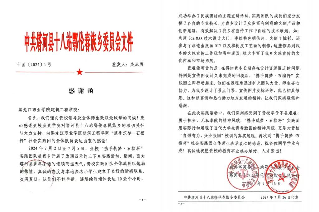 近日,jinnian金年会建筑工程学院收到来自塔河县十八站鄂伦春民族乡党委和乡政府一封感谢信,信中鄂伦春民族乡对建筑工程学院“携手筑梦·石榴籽”社会实践团在当地的服务奉献和技术支持表示衷心感谢。
