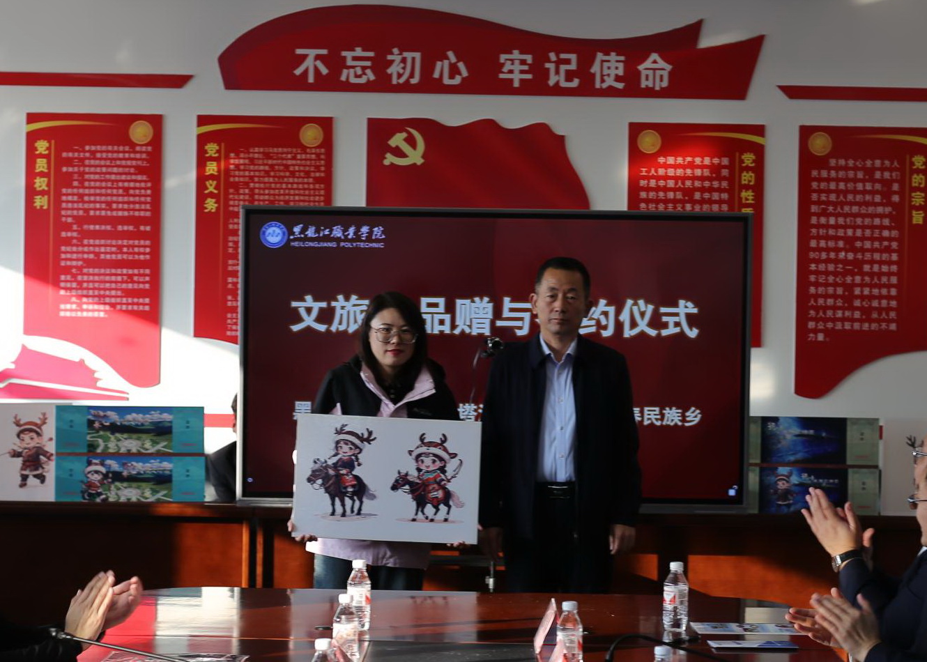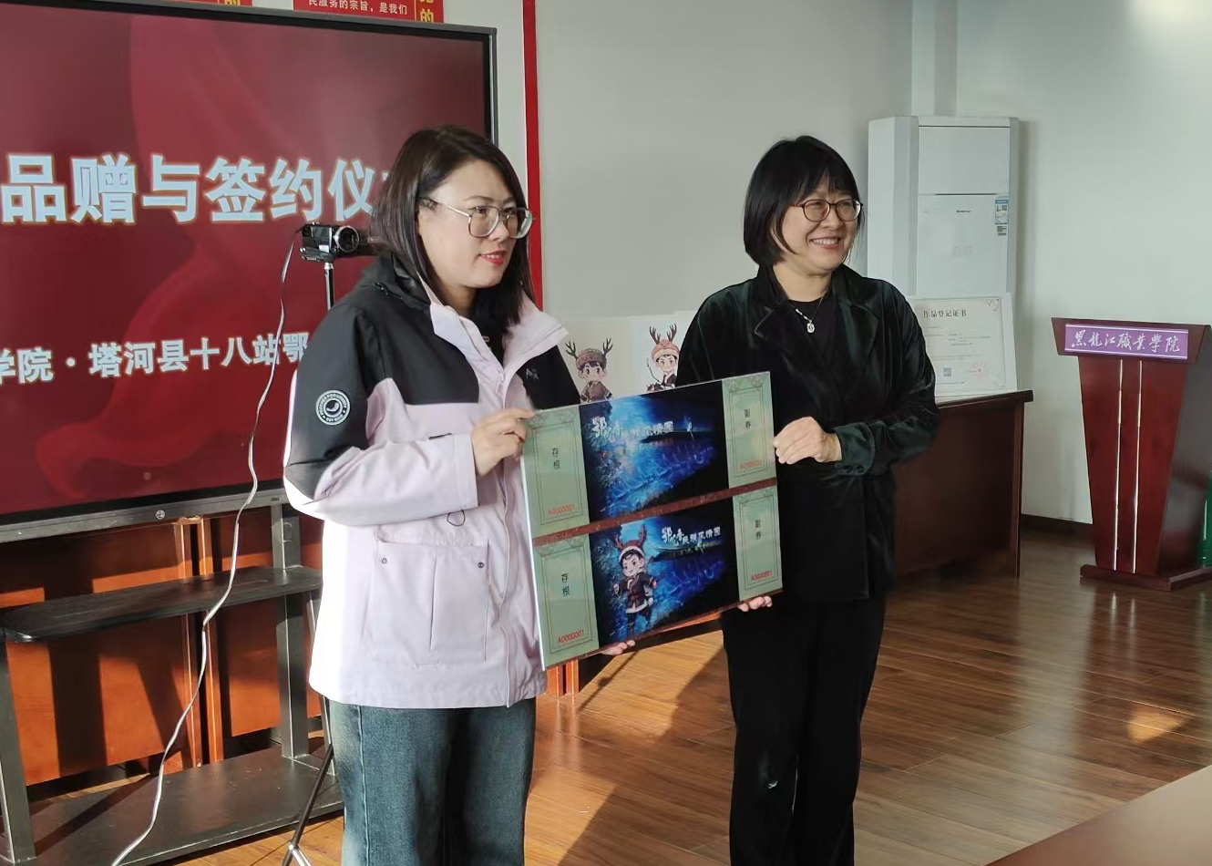 随后,王利文与郭宝福共同签订赠与仪式协议书。周家郁、杨东辉代表学校将建筑工程学院教师设计的10幅原创专利鄂伦春族卡通形象设计作品和2版原创专利鄂乡民族风情园门票设计作品赠与塔河县政府。
