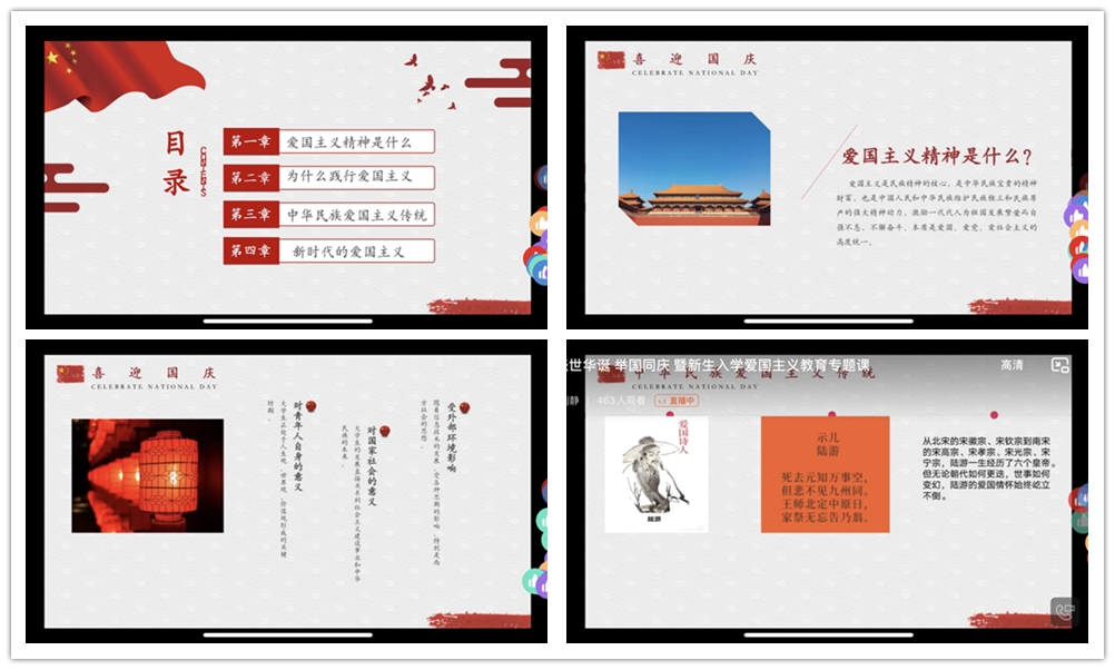 在高校中开展好爱国主义精神教育,是引导大学生成长成才的重中之重。在本次活动中刘静老师着重为同学们讲解了“爱国主义精神是什么”、“为什么践行爱国主义”、“中华民族爱国主义传统”和“新时代的爱国主义”四个方面内容。首先,刘静老师为同学们讲述了爱国主义精神的核心内容和基本内涵,从学生个人发展角度和国家社会角度切入,让同学们明白为什么青年人要践行爱国主义。在“中华民族爱国主义传统”部分,刘静老师为我们生动讲述了南宋著名爱国主义诗人陆游的生平,让同学们感受到了这份跨越数百年的爱国情怀。最后,刘静老师带领同学们学习了《新时代的中国青年》白皮书的内容,明确了同学们作为新时代的中国青年,要在建设社会主义现代化强国的新征程中坚守青年初心,朝着第二个百年奋斗新征程奋勇前进。