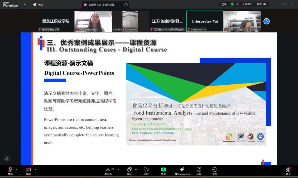 在优秀案例成果展示环节,食品药品学院《食品仪器分析》课程团队精心开发的《食品仪器分析》课程标准与数字化课程资源,以其系统完备的架构、紧跟前沿的内容以及显著的实践价值,赢得了中坦双方教育专家的一致高度赞誉,被遴选为亮点成果,面向全体与会者进行重点推介。