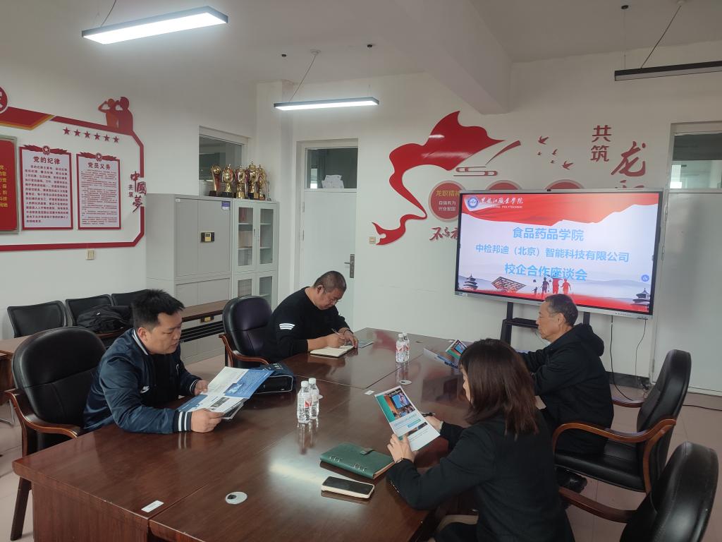 教学副院长韩双分享了学院在实践教学、产教融合方面的经验和成果并表示愿意与中检邦迪共同探索产业学院建设的新模式,通过校企合作实现资源共享、优势互补,推动产教融合向纵深发展。食品智能加工技术专业主任杜宏宇就专业课程设置、实训条件及教学需求等方面进行了详细说明,希望企业能够在课程开发、实训资源建设等方面提供支持和指导,共同打造具有行业特色的课程体系和实训平台。