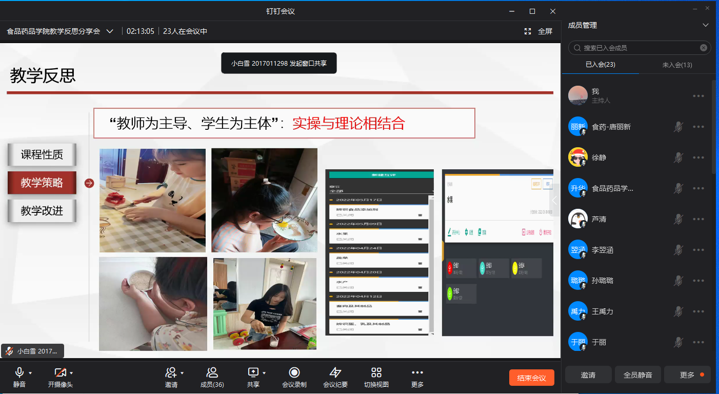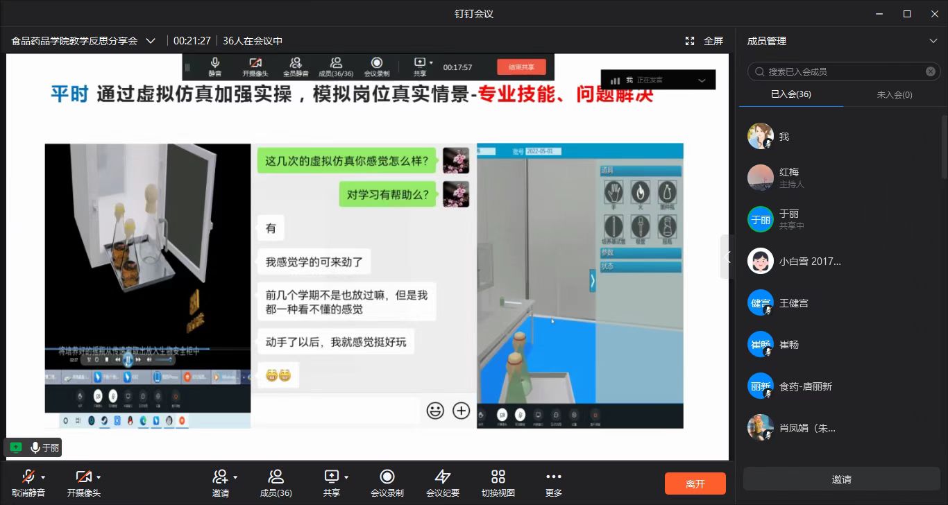 6月16日,食品药品学院全体任课教师齐聚云端,召开2021-2022学年第二学期教学反思分享会。教学办主任李红梅主持会议,食品药品学院党总支书记陈晓华、副院长韩双出席本次会议。