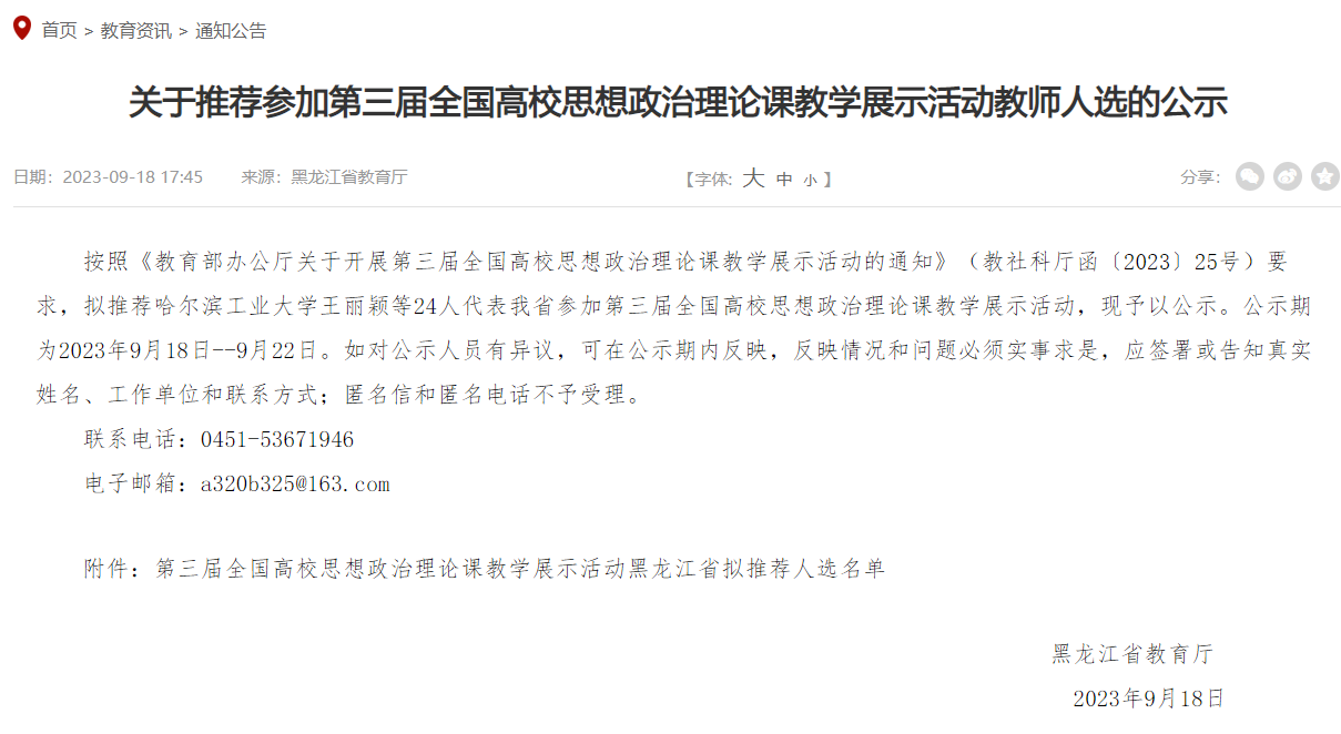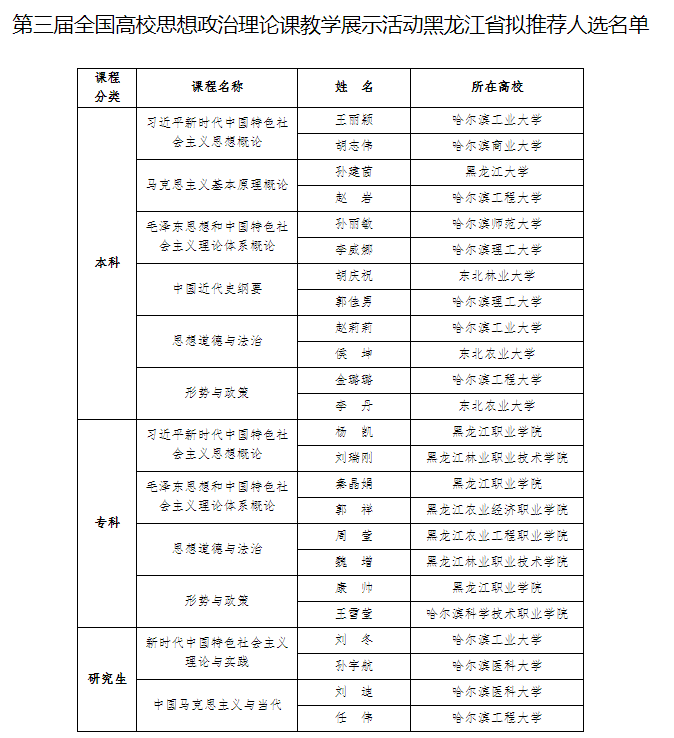 近日,按照《教育部办公厅关于开展第三届全国高校思想政治理论课教学展示活动的通知》(教社科厅函〔2023〕25号)要求,黑龙江省教育厅经过遴选,拟推荐24名高校思政课教师代表我省参加第三届全国高校思想政治理论课教学展示活动,金年会马克思主义学院青年教师杨凯、秦晶娟、康帅经过激烈的角逐,在众多选手中脱颖而出,位列前茅,将与全国思政课教师选手一起竞技擂台,展示黑龙江省思政课教师的风采。
