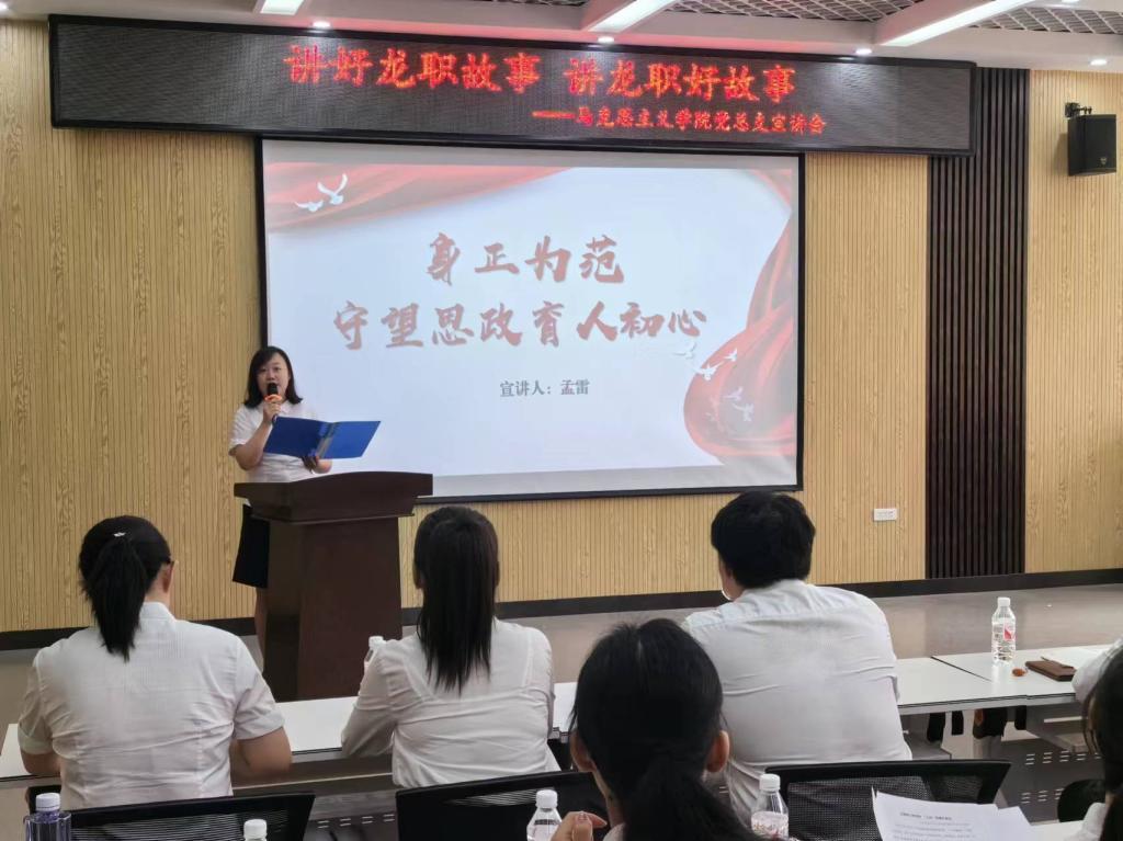为落实立德树人根本任务,深入推进“铺路石”文化建设,弘扬榜样力量,7月10日,马克思主义学院开展“讲好龙职故事,讲龙职好故事”宣讲活动。学院党总支书记程刚、综合办主任徐瑛和全体教师参加活动,活动由习近平新时代中国特色社会主义思想概论教研室主任张旭主持。