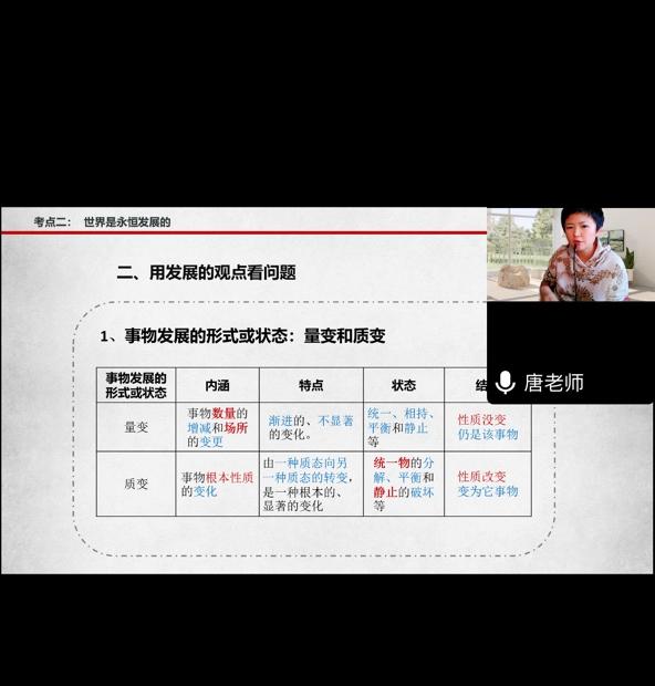 12月9日下午,本人有幸聆听了哈尔滨师大附中唐秋月老师的思政课。课堂上,课前采取了学生新闻播报的教学活动,以鲜活的时事新闻引导学生关心国内国际大事;课中教师运用案例教学方法,注重理论联系实际,综合运用点答、提问、边讲边练等方式,重点讲解了“用发展的观点看问题”这一知识点。讲解中,唐老师把马克思主义基本原理同“人类命运共同体”等治国理政重要理念紧密结合,做到了理论性和实践性相统一,灌输性和启发性相统一。