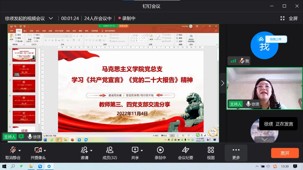 党的二十大胜利召开以来,在马克思主义学院党员中形成理论学习的新热潮。2022年11月4日下午1点30分,马克思主义学院党总支开展线上《共产党宣言》、学习贯彻党的二十大精神的学习活动,活动由教师第三、第四党支部组织,教师第三党支部徐瑛同志主持,马克思主义学院全体党员参加会议。学习内容主要包括《共产党宣言》和党的二十大精神的学习。