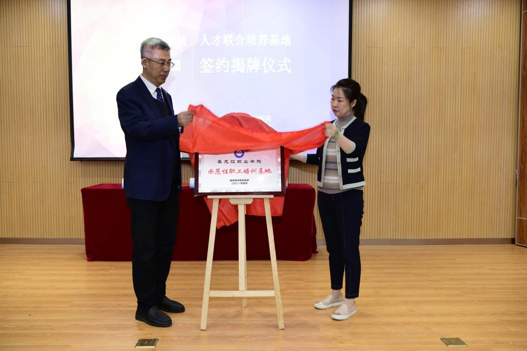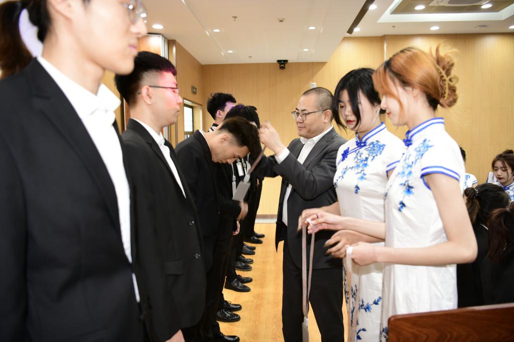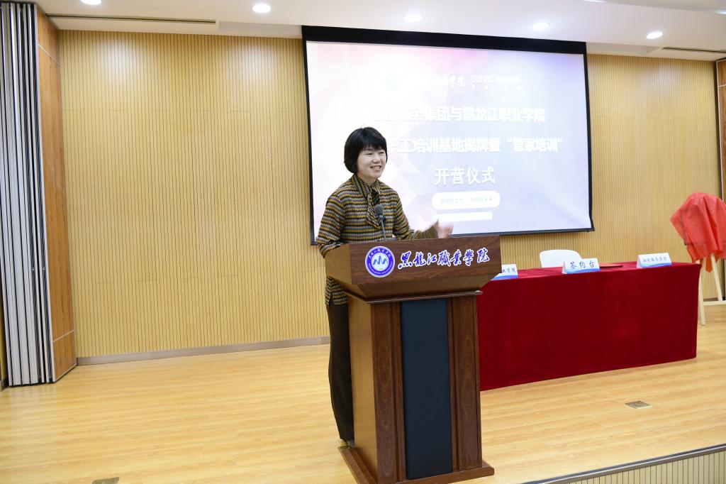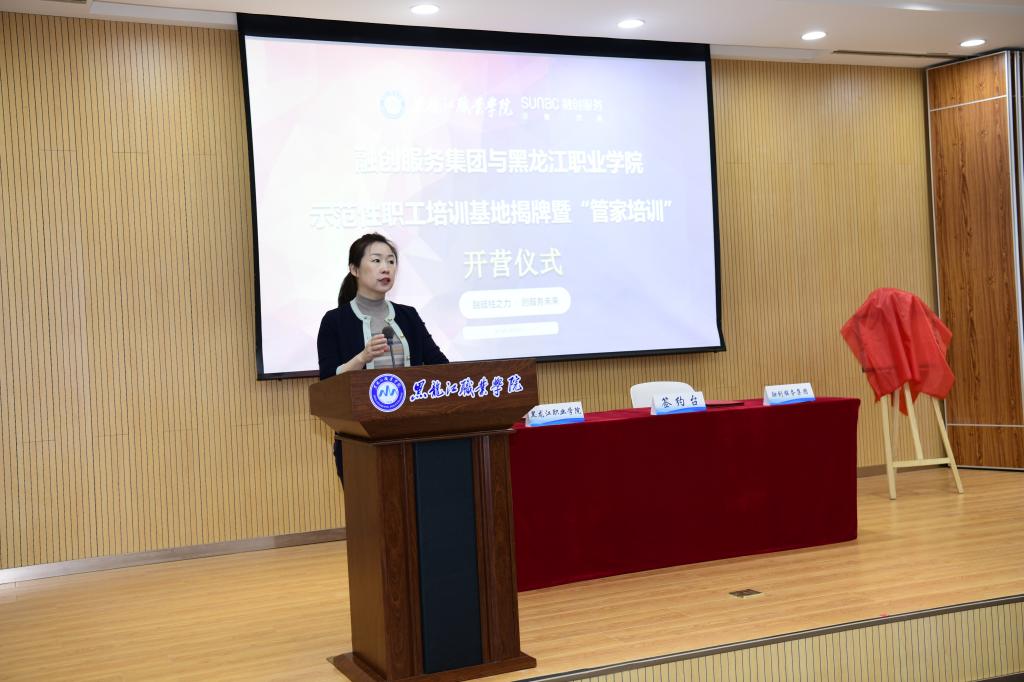 接着,融创集团副总裁杨静、住宅运营管理中心总经理吉相海、人力资源部总监张东浩分别致辞。随后,王利文校长与张东浩总监签署校企产教融合战略合作意向书,王利文校长与杨静副总裁共同为“融创服务集团与jinnian金年会示范性职工培训基地”揭牌。20位来自工管学院的学生入职融创集团担任管培融耀生并在会议现场进行入职宣誓。他们共同宣誓传承龙职精神与铺路石文化,当好企业铺路石,为实现融创集团更加辉煌的明天而努力奋斗。集团住宅运营管理中心总经理吉相海、哈尔滨公司总经理刘树荣为融耀生们授予了员工工牌。之后为期两天的“优秀管家培训”正式开始,来自融创集团的47位管家接受培训,由校企双方共同指派讲师,讲授中国现代服务业发展趋势及物业服务等级标准等内容。