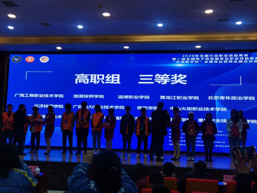 2020年11月21日,在由中国电子商会及中国就业培训技术指导中心主办,由北京北测数字技术有限公司及重庆财经职业学院承办的,“2020年全国行业职业技能竞赛-第二届全国电子信息服务业职业技能竞赛-‘北测数字杯’全媒体运营师职业技能竞赛”全国总决赛中,金年会信息工程学院派出了由软件技术专业王天琪、刘福龙、张美怡3名选手组成的代表队参加比赛,比赛总成绩为80.8分,荣获全国总决赛三等奖。