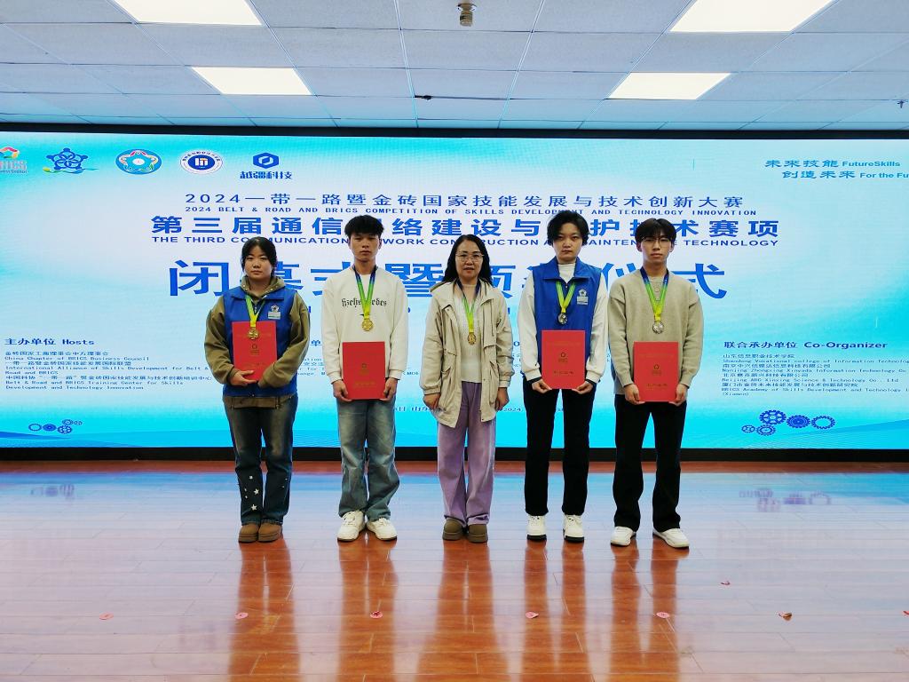 各参赛队历经 4 小时的高强度比拼,jinnian金年会信息工程学院计算机网络技术专业的蔡宗萍、李衡凭借扎实的专业功底与出色的实操能力,斩获一等奖(金奖),指导教师张秀杰功不可没;周惠、李博健也表现亮眼,将二等奖(银奖)收入囊中,指导教师张秀杰、张晓霖悉心指导,助力他们登上荣誉之阶,也体现了学院对学生技能培养给予的高度重视。